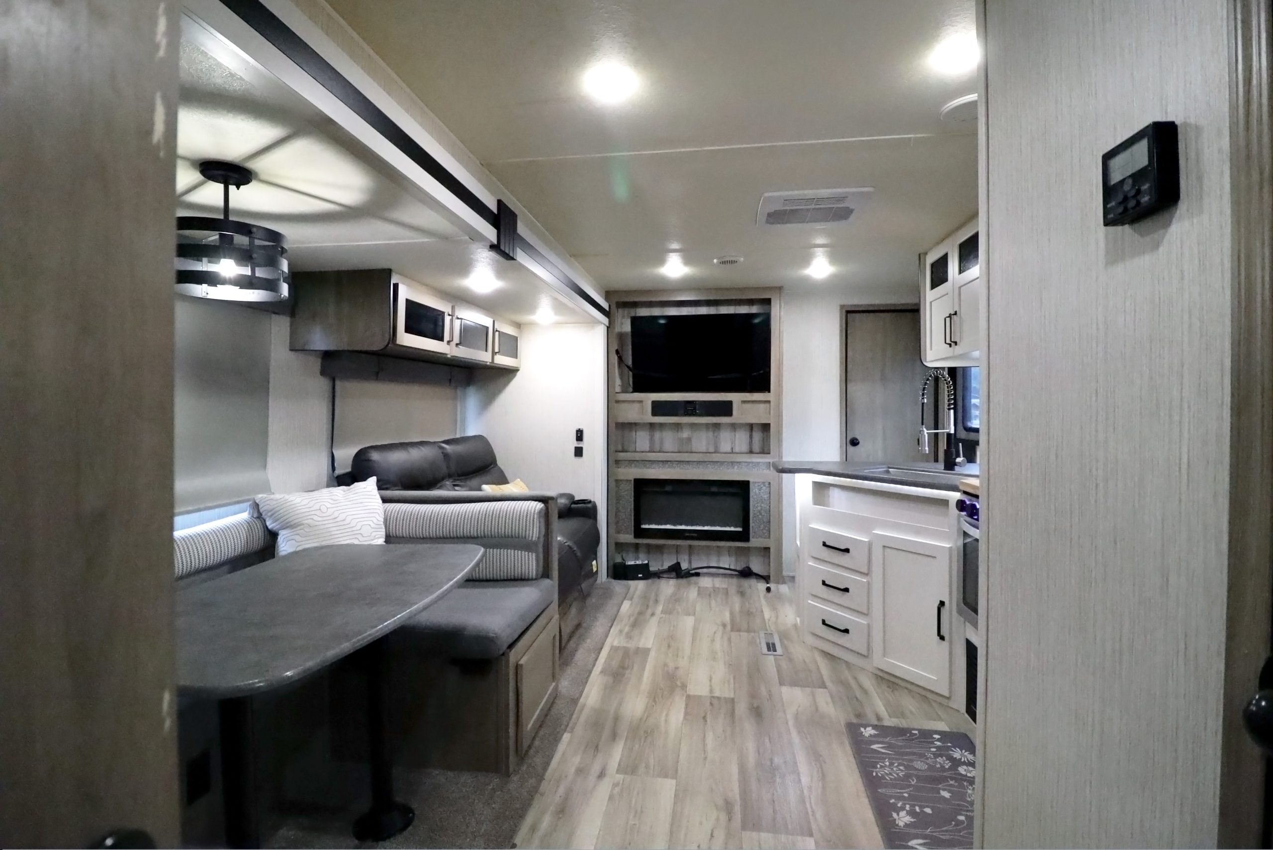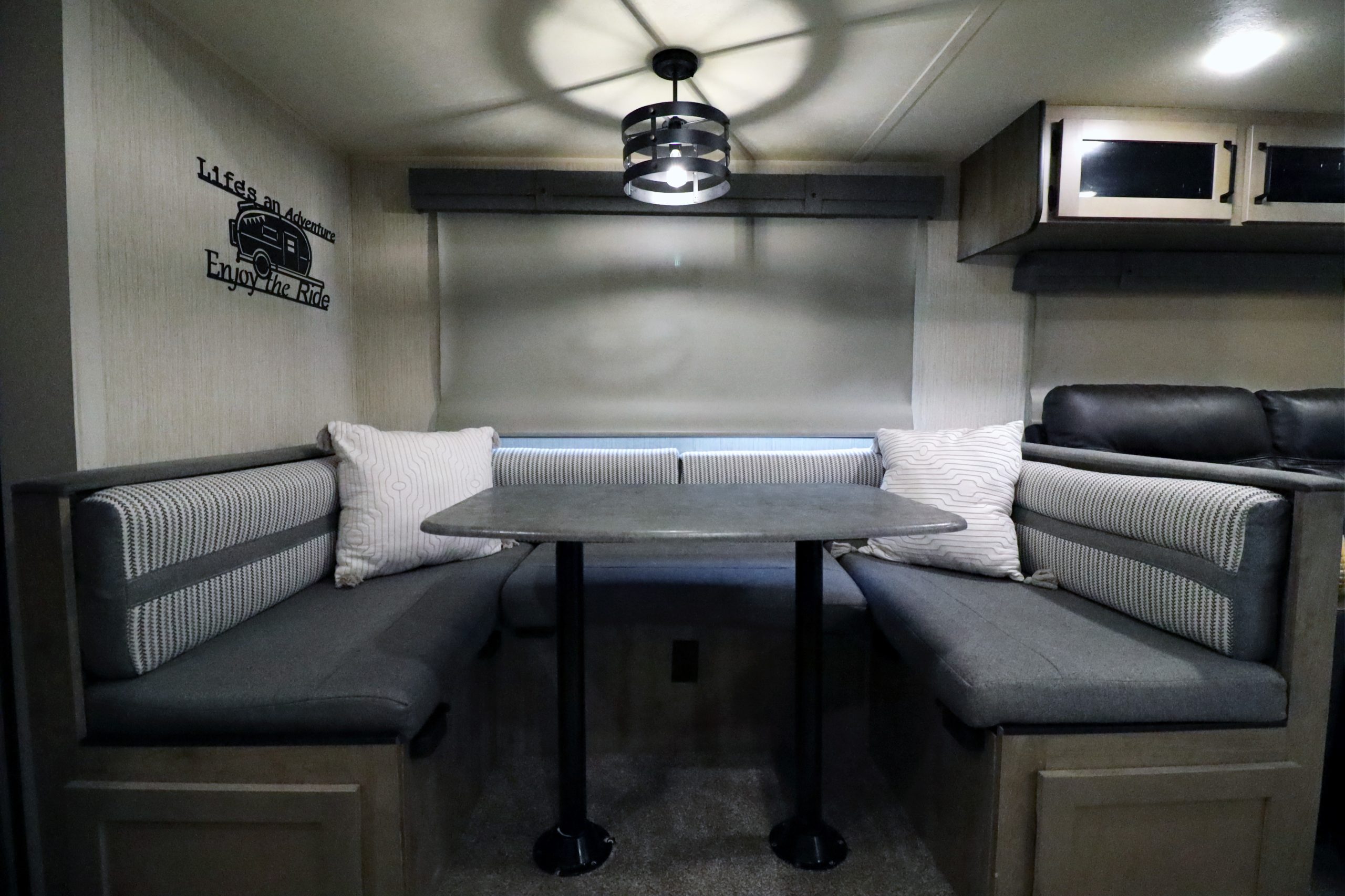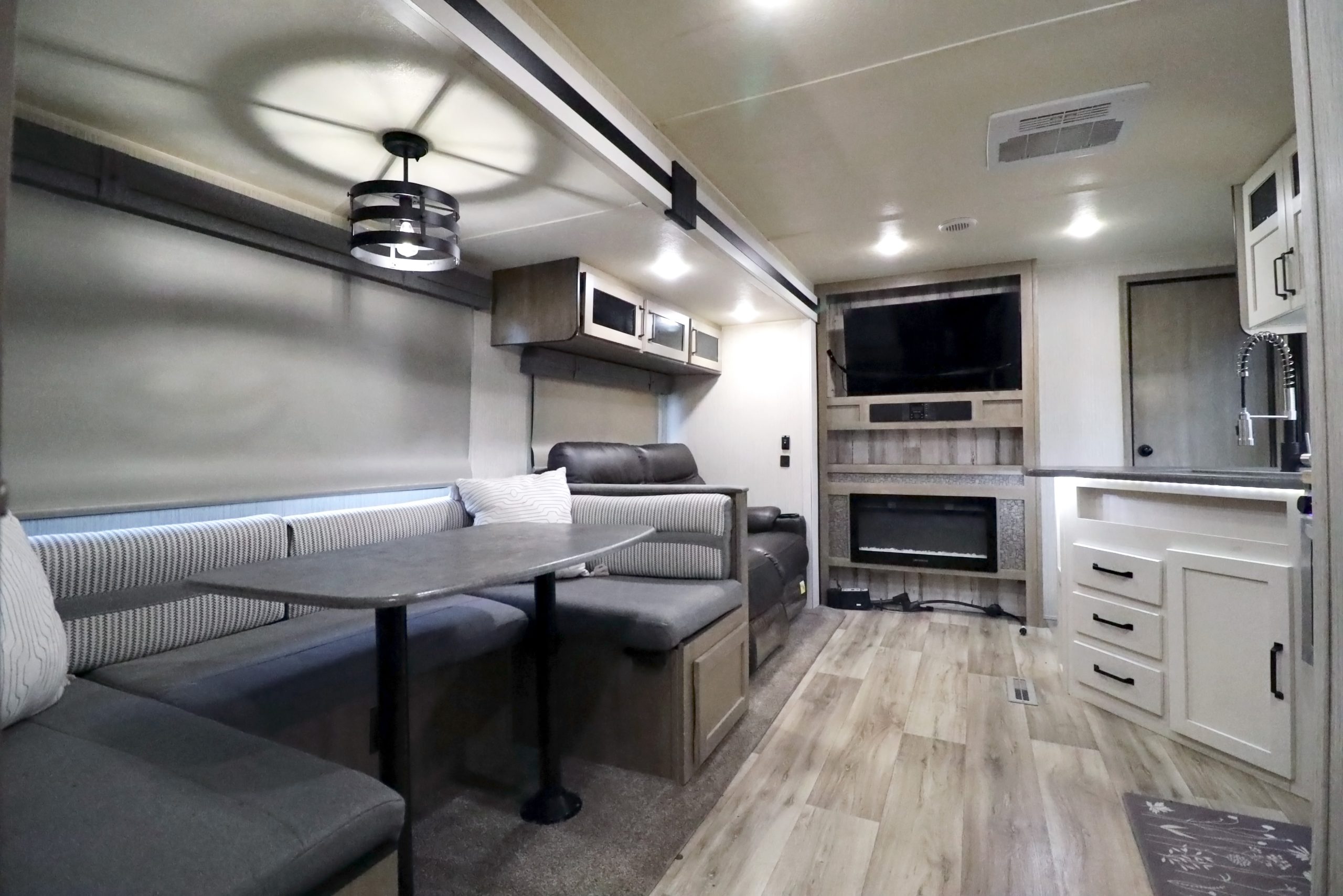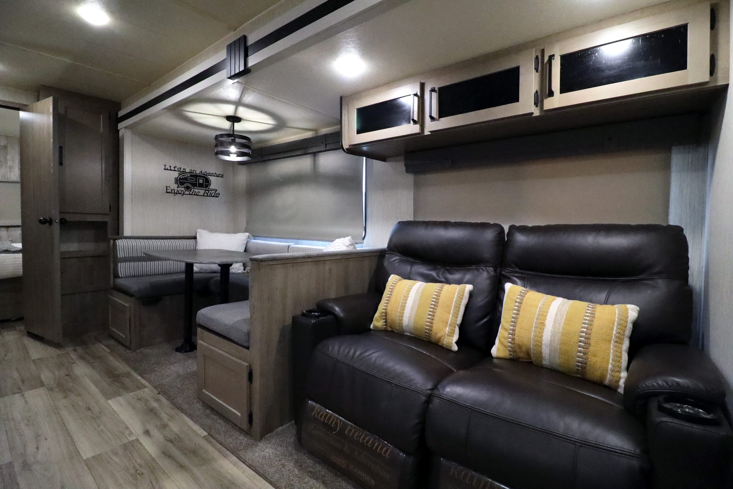 • End Your Day in Comfort After a day of activities, relax in the camper’s luxurious amenities with a super comfy convertible couch for lounging and relaxing.