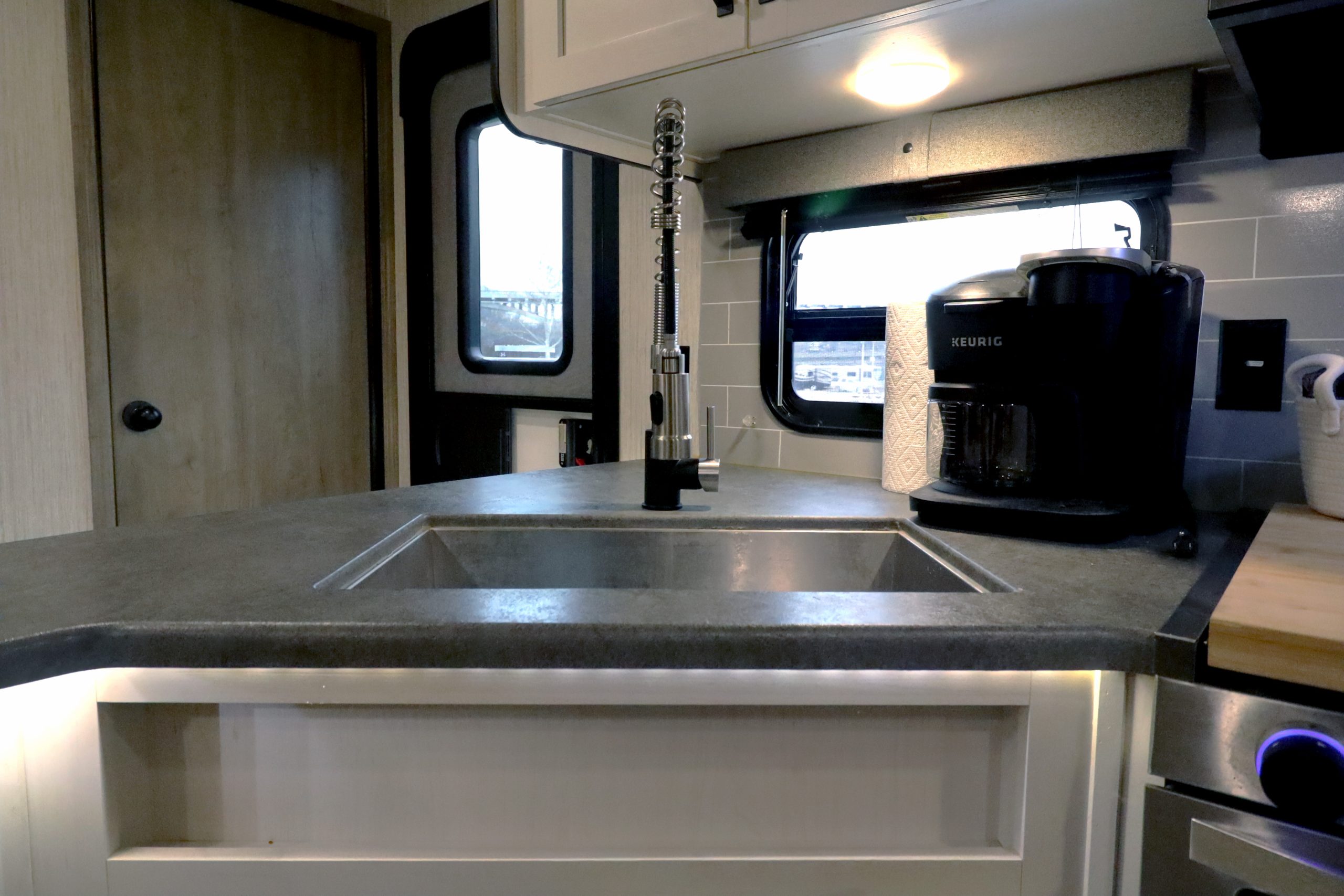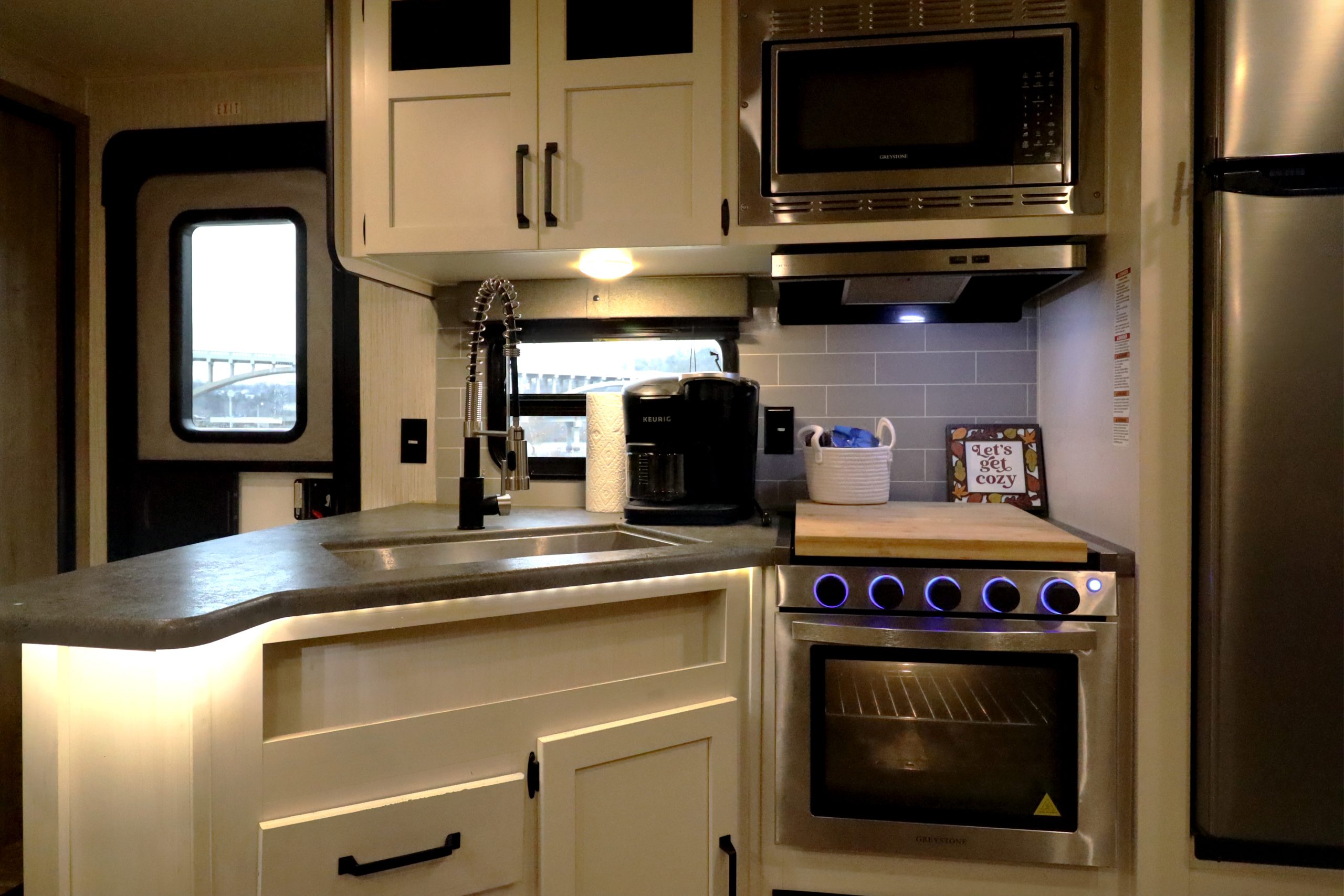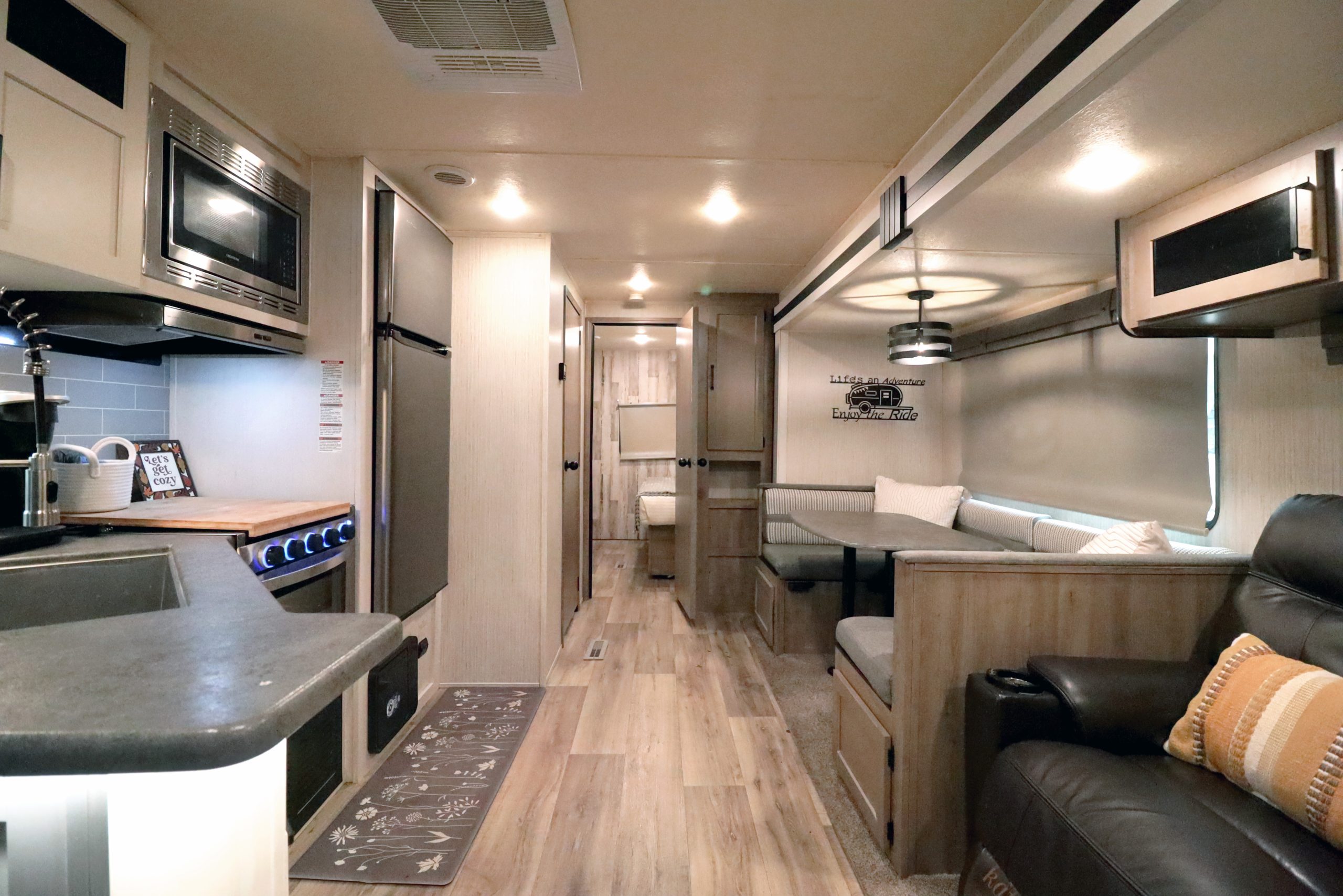 • End Your Day in Comfort After a day of activities, relax in the camper’s luxurious amenities with a super comfy convertible couch for lounging and relaxing.