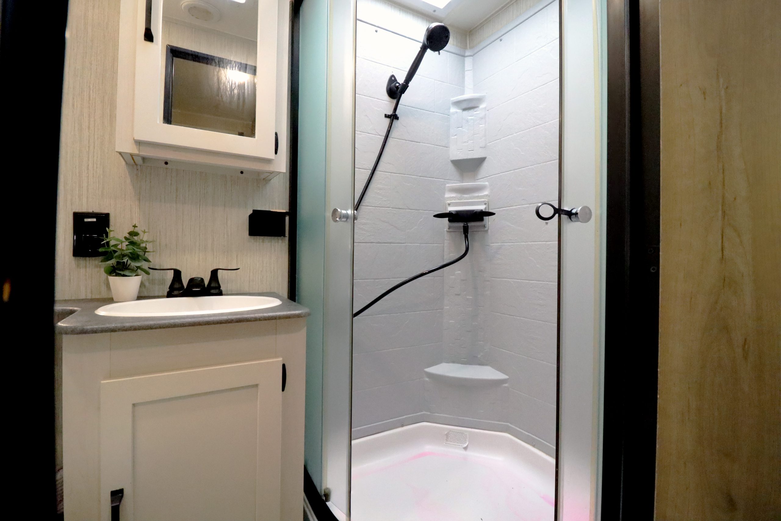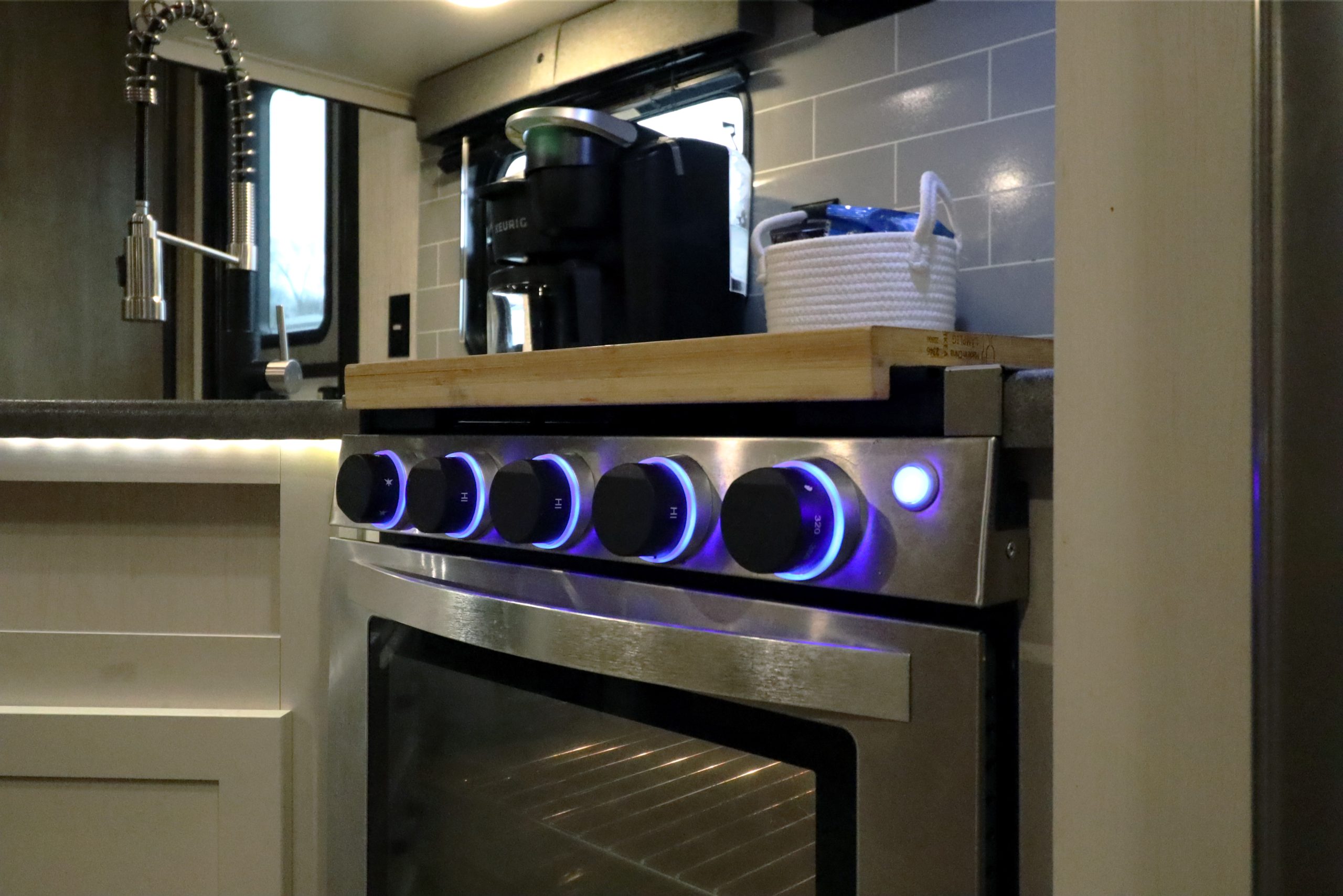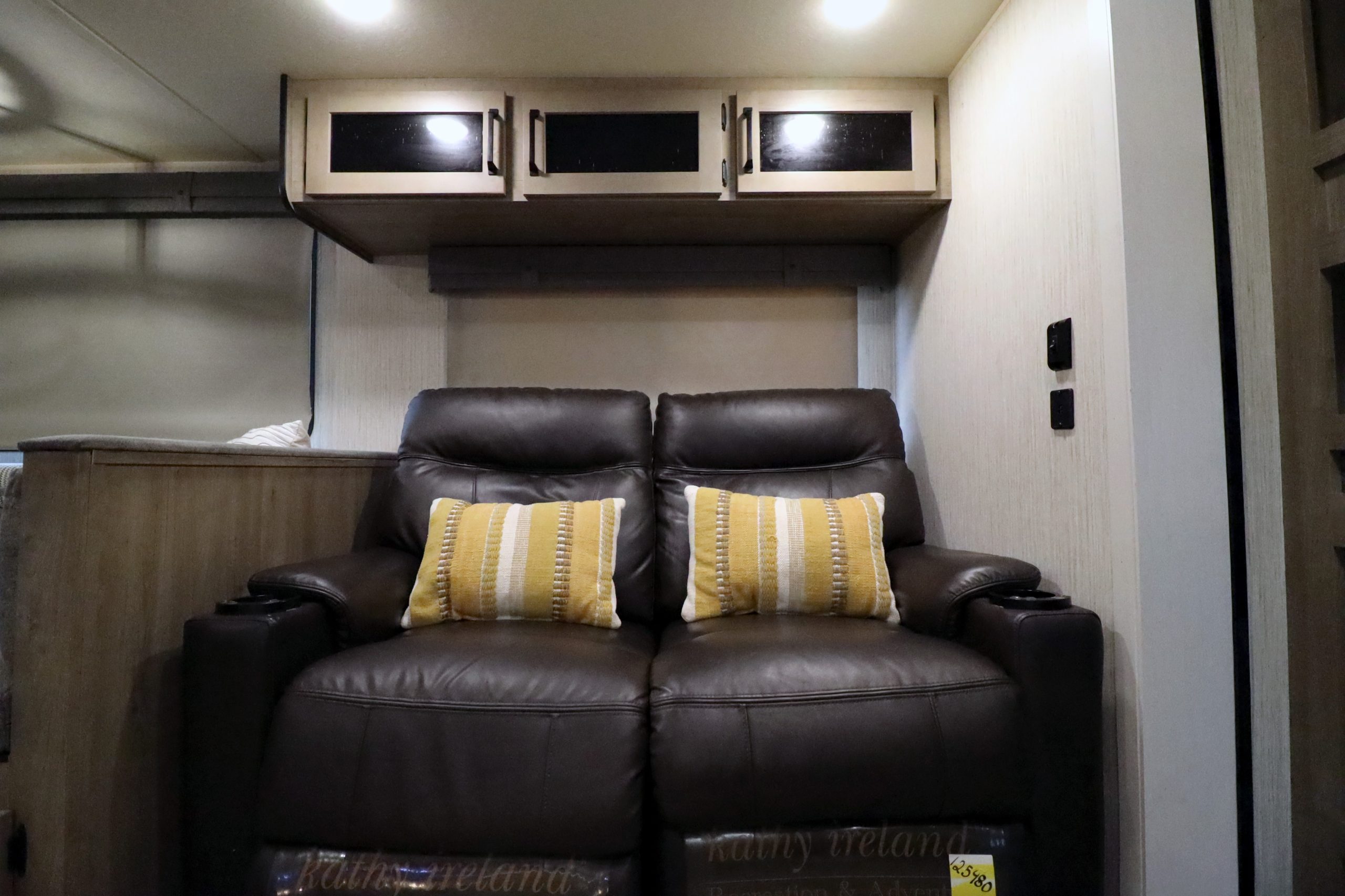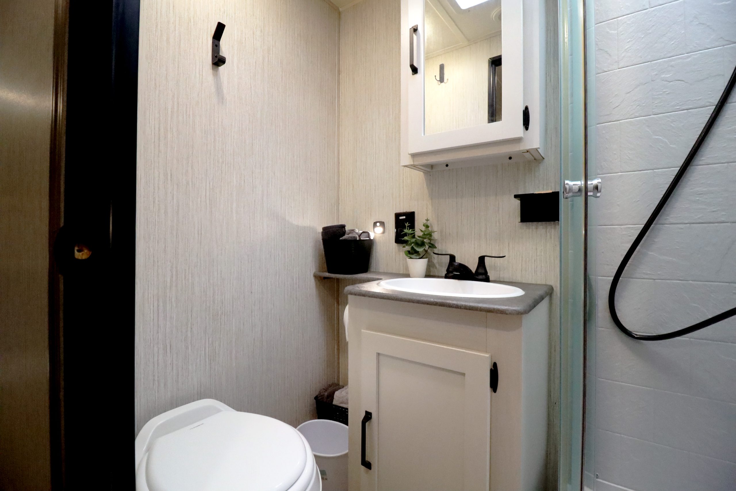 • End Your Day in Comfort After a day of activities, relax in the camper’s luxurious amenities with a super comfy convertible couch for lounging and relaxing.