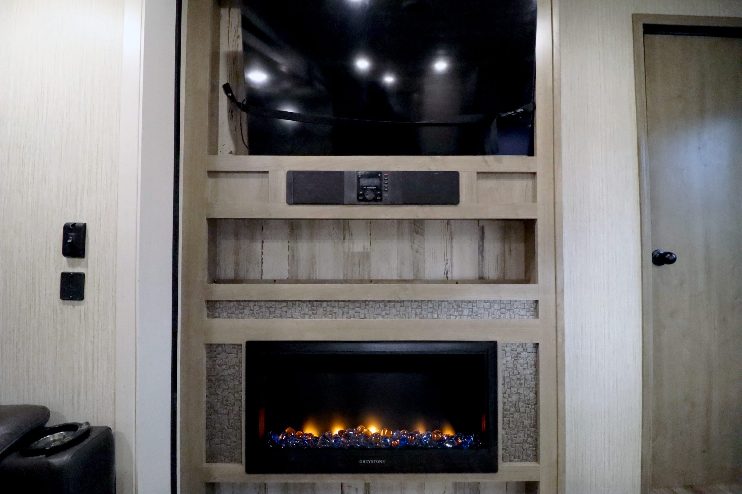 • Entertainment: A comfy 2-seat power-reclining love seat and dinette area with a fireplace, TV for movies and games.