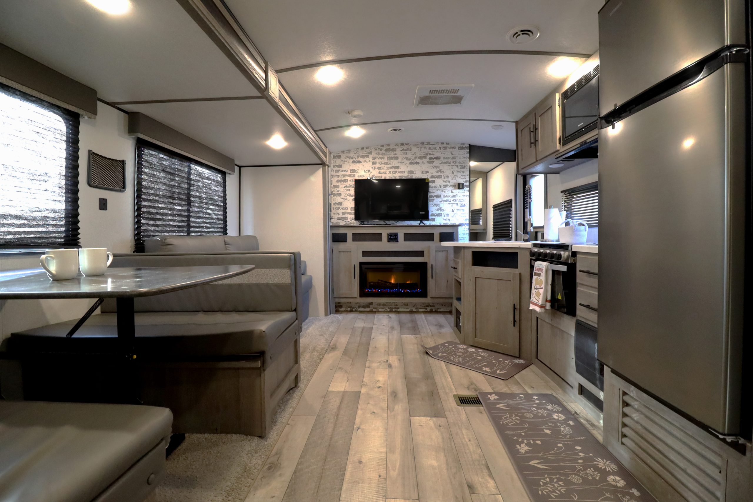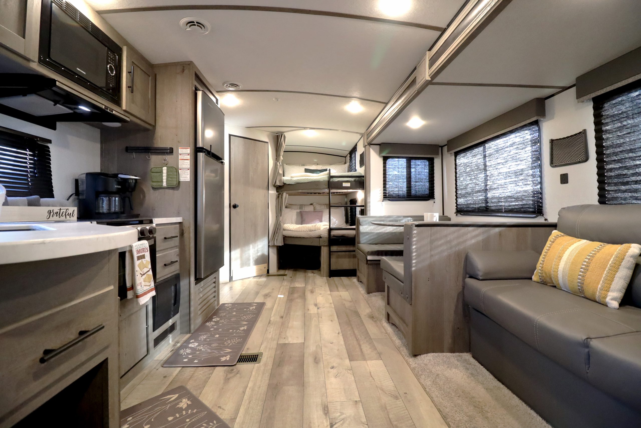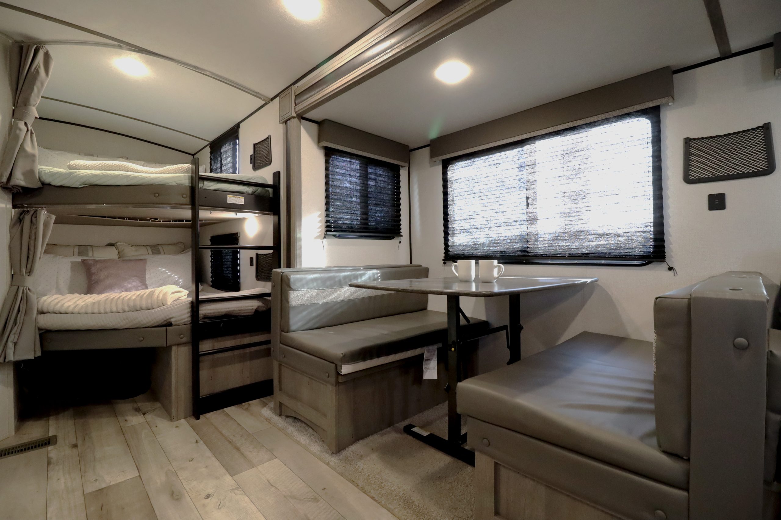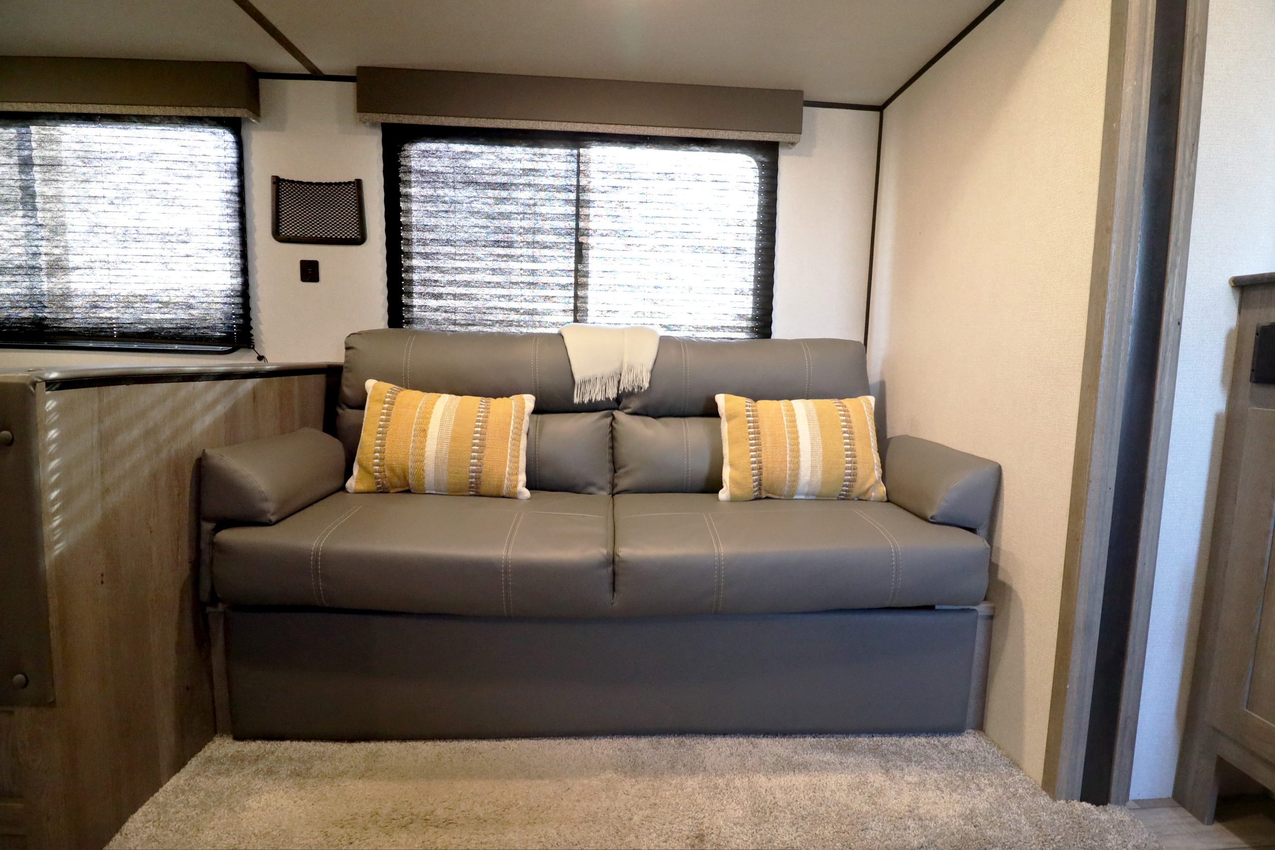 - End Your Day in Comfort After a day of activities, relax in the camper’s luxurious amenities with a super comfy convertible couch for lounging and relaxing.