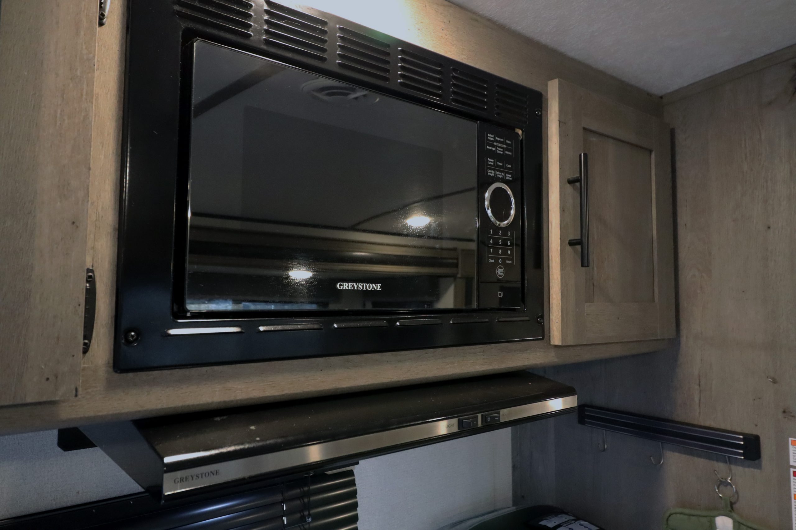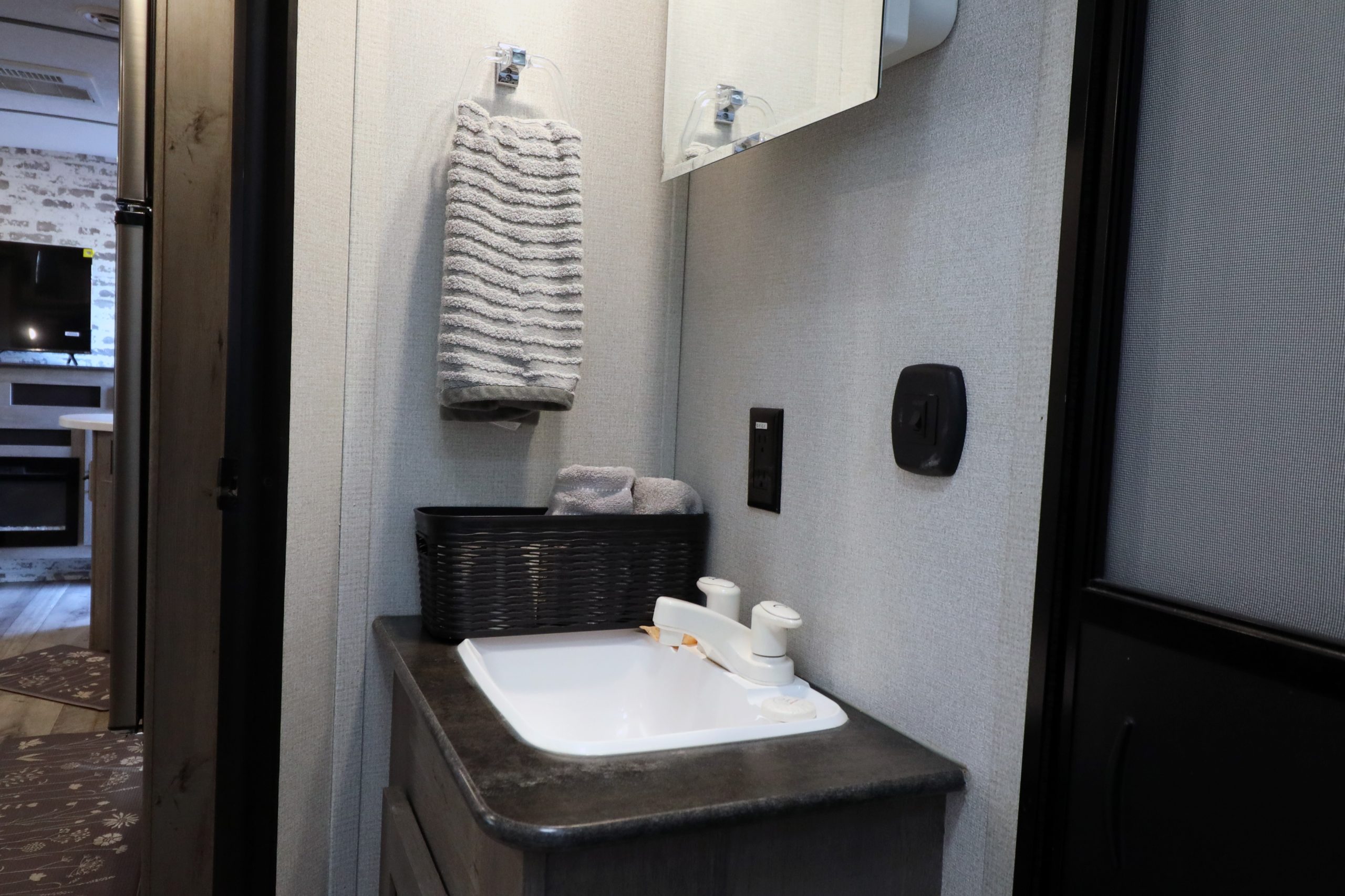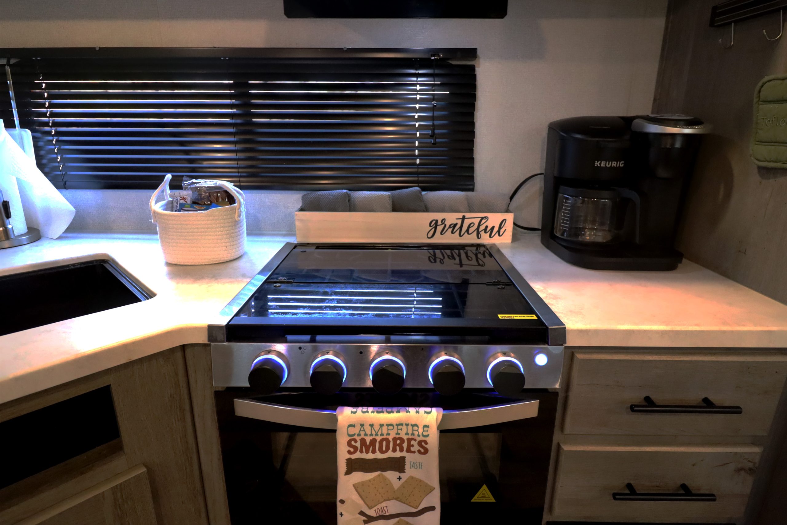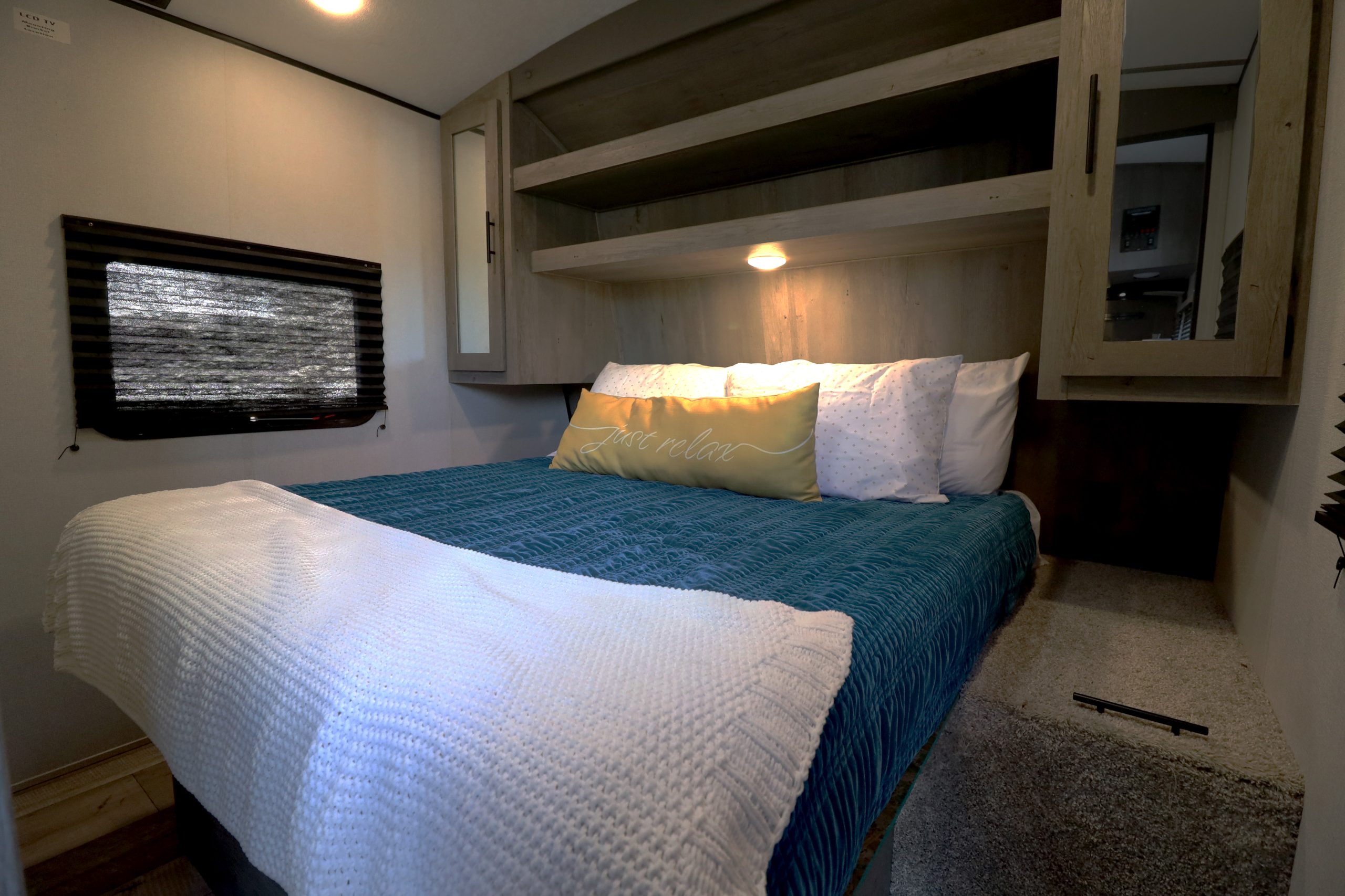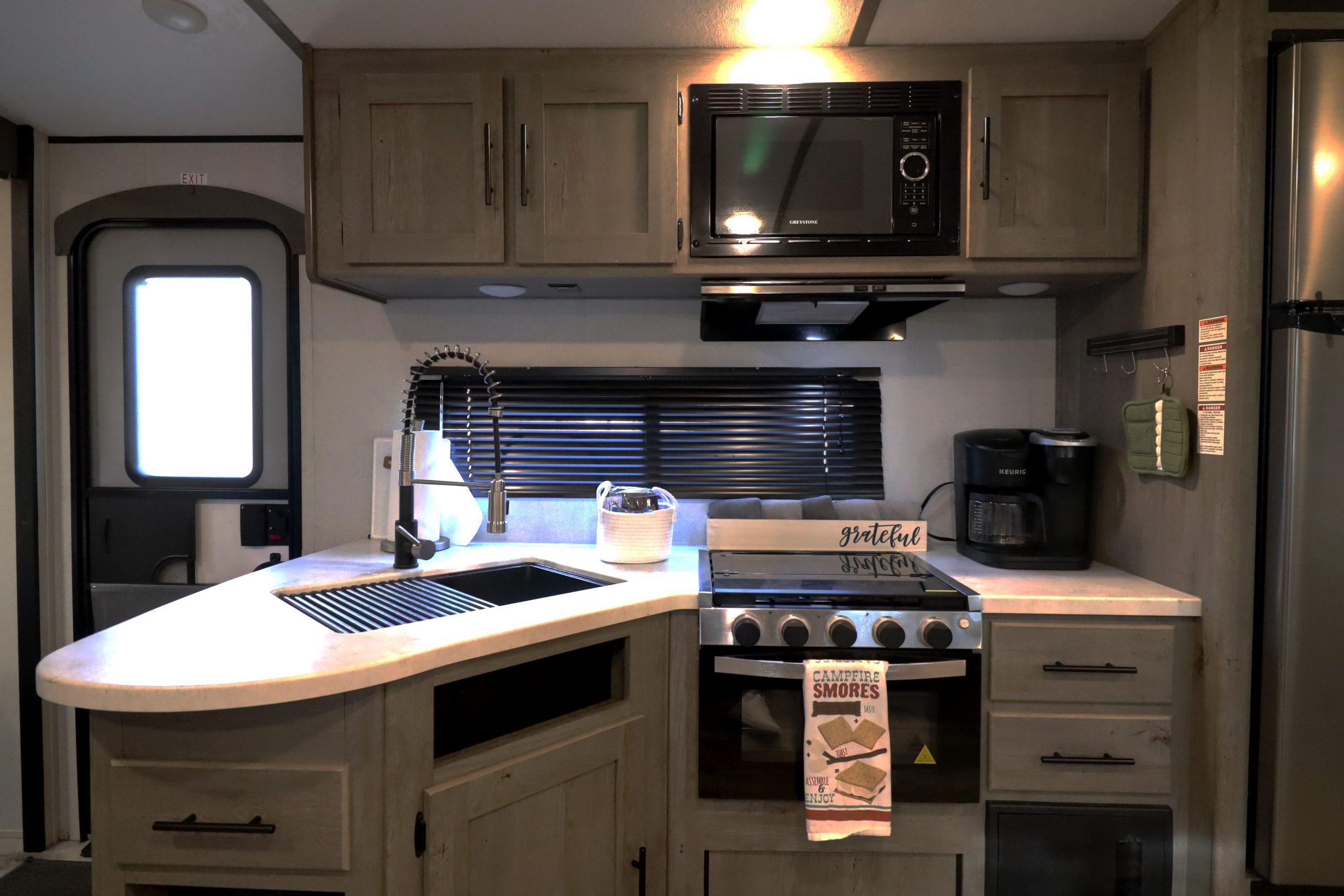 - End Your Day in Comfort After a day of activities, relax in the camper’s luxurious amenities with a super comfy convertible couch for lounging and relaxing.