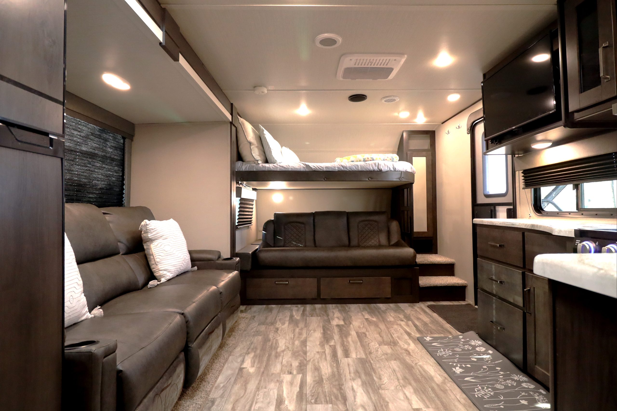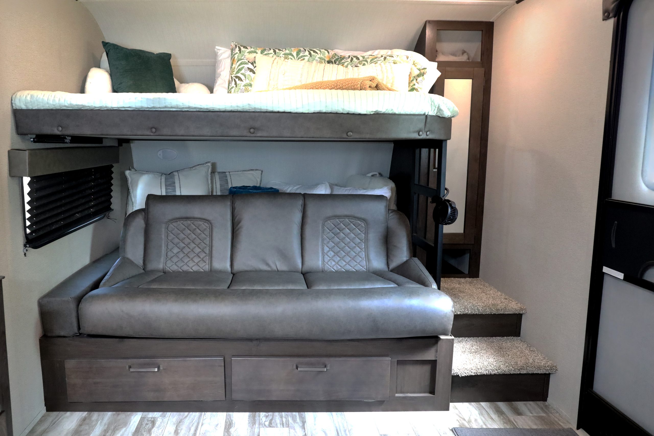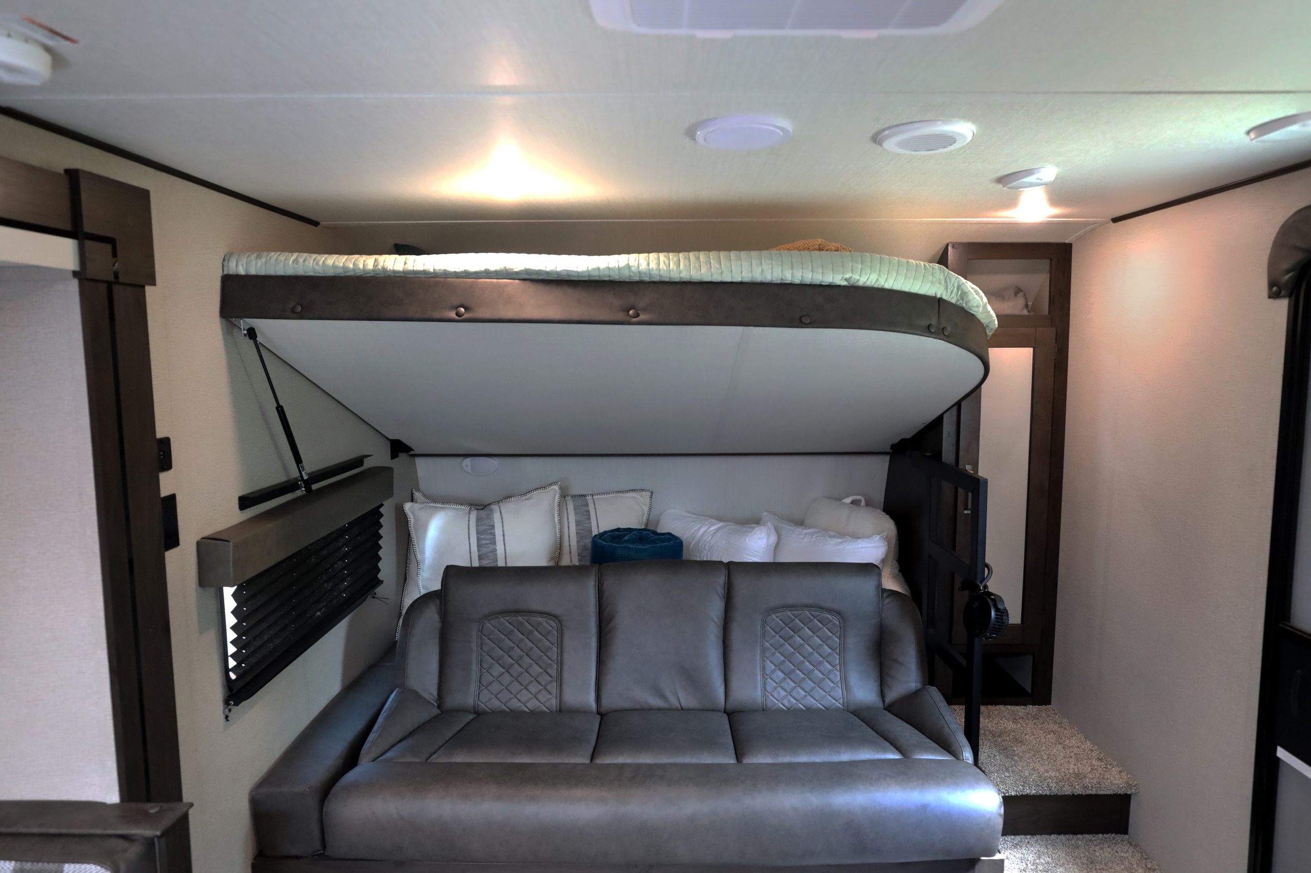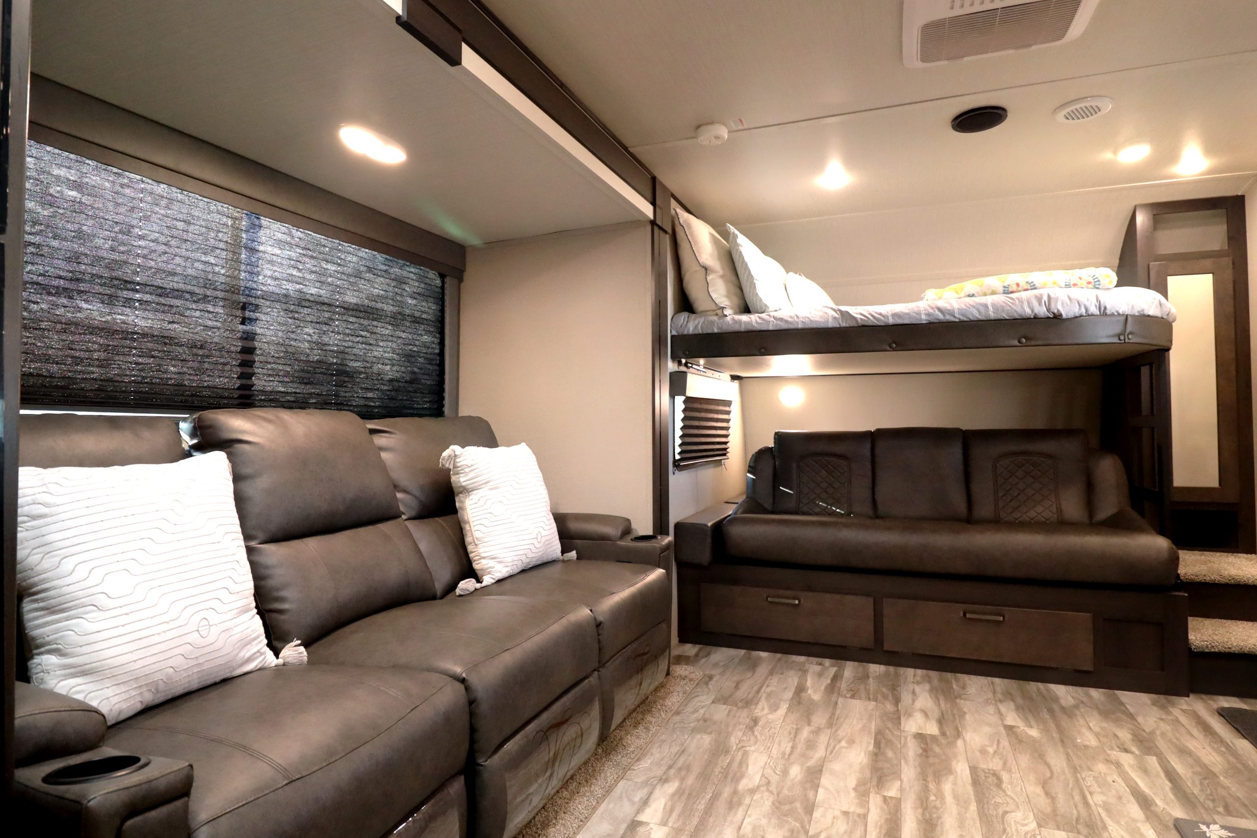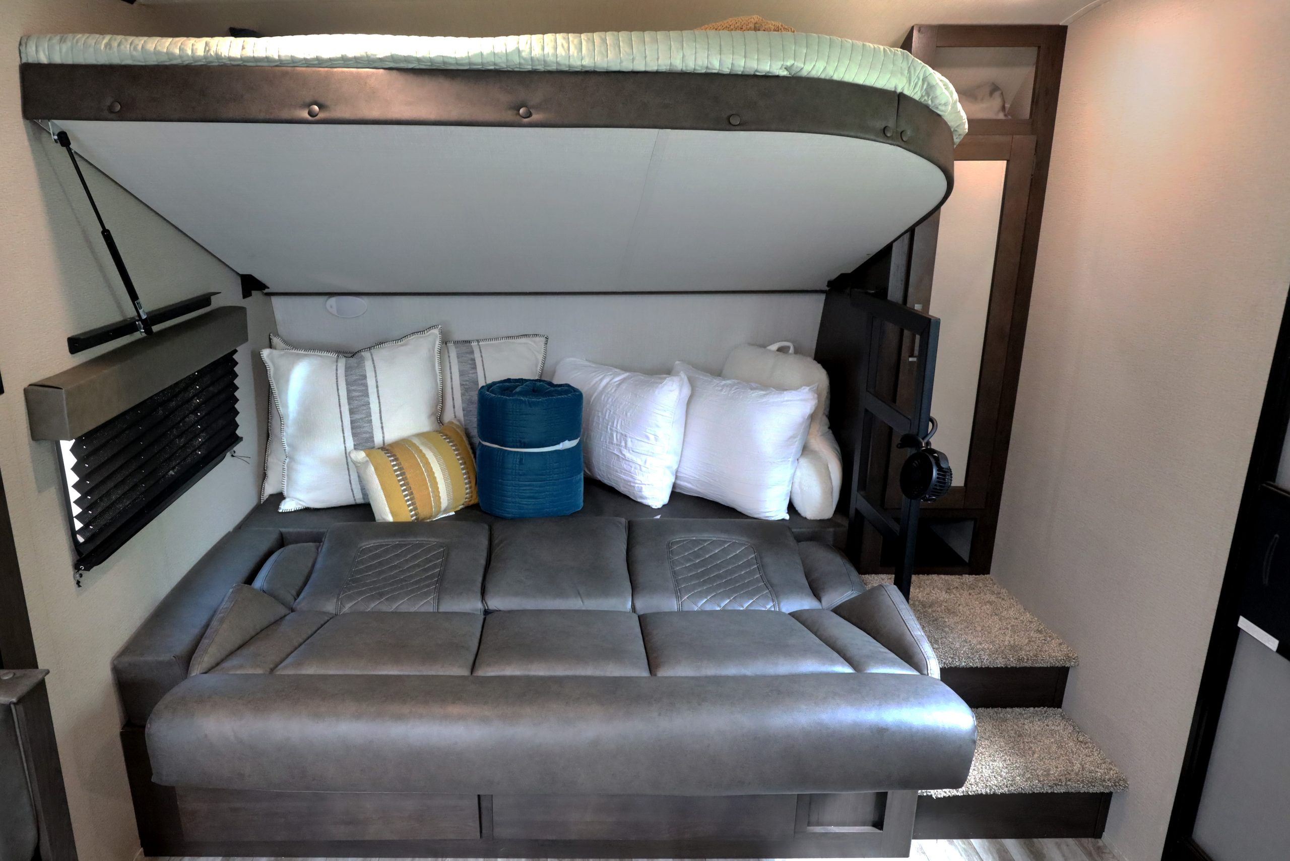 • End Your Day in Comfort After a day of activities, relax in the camper’s luxurious amenities with a super comfy convertible couch for lounging and relaxing.