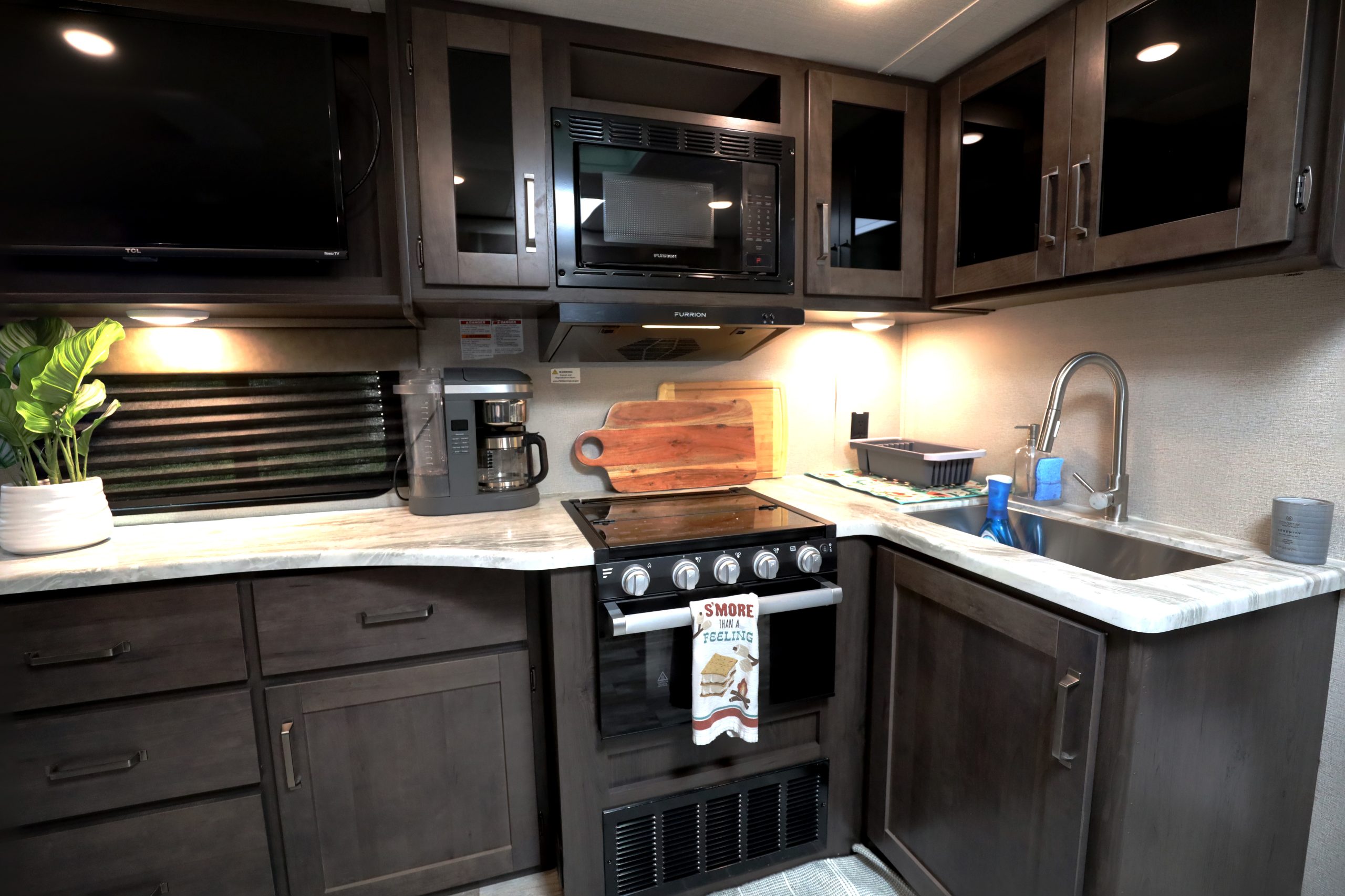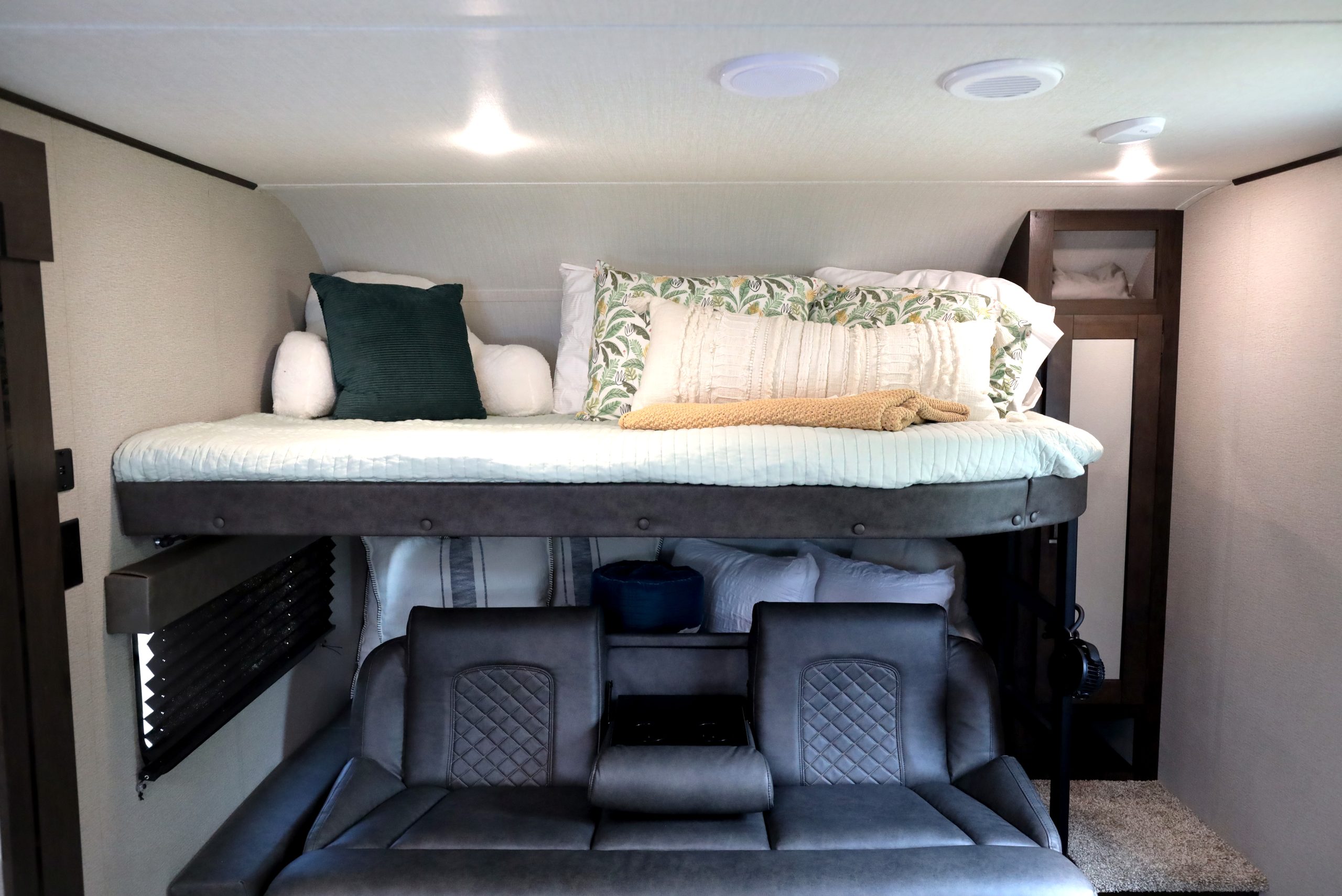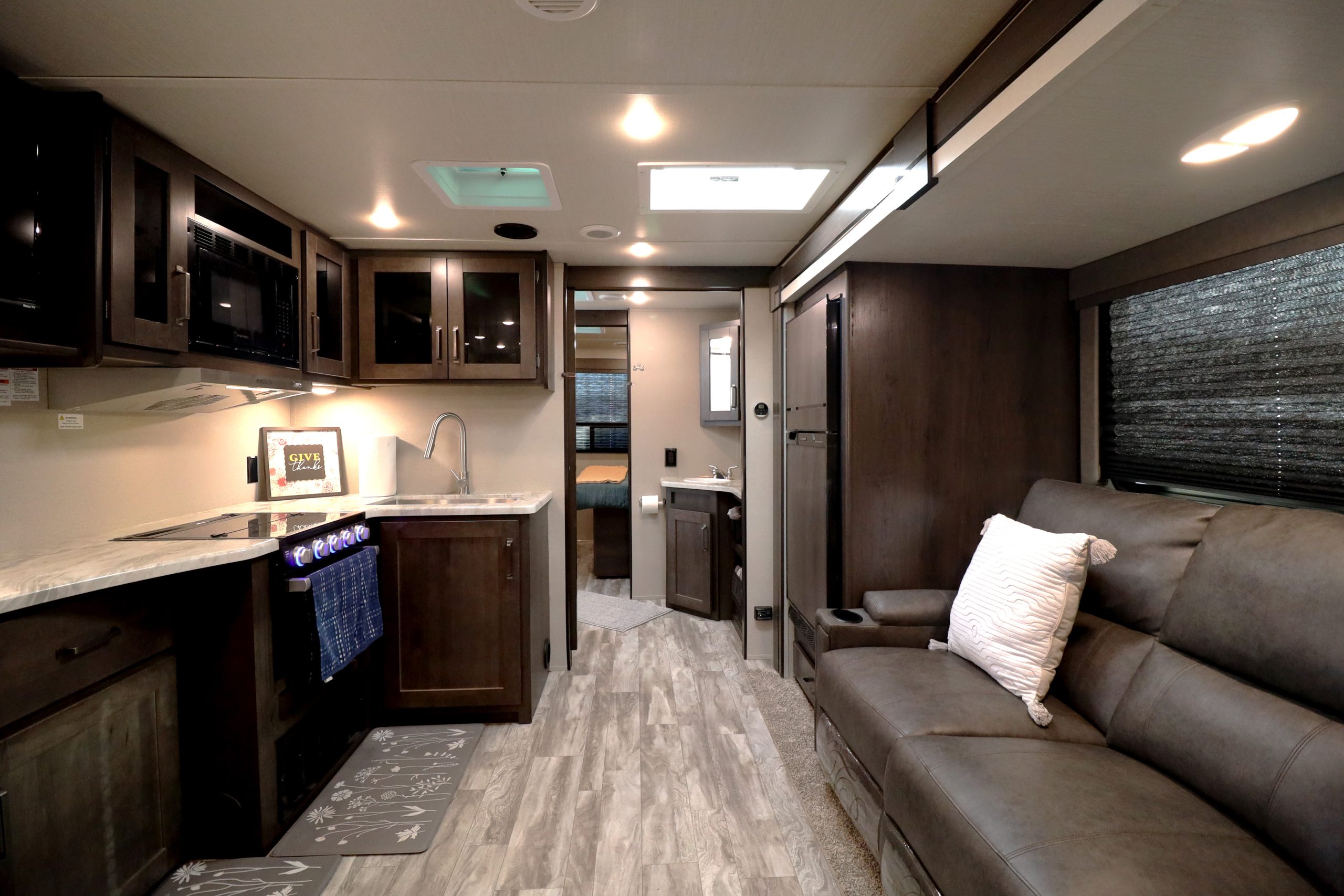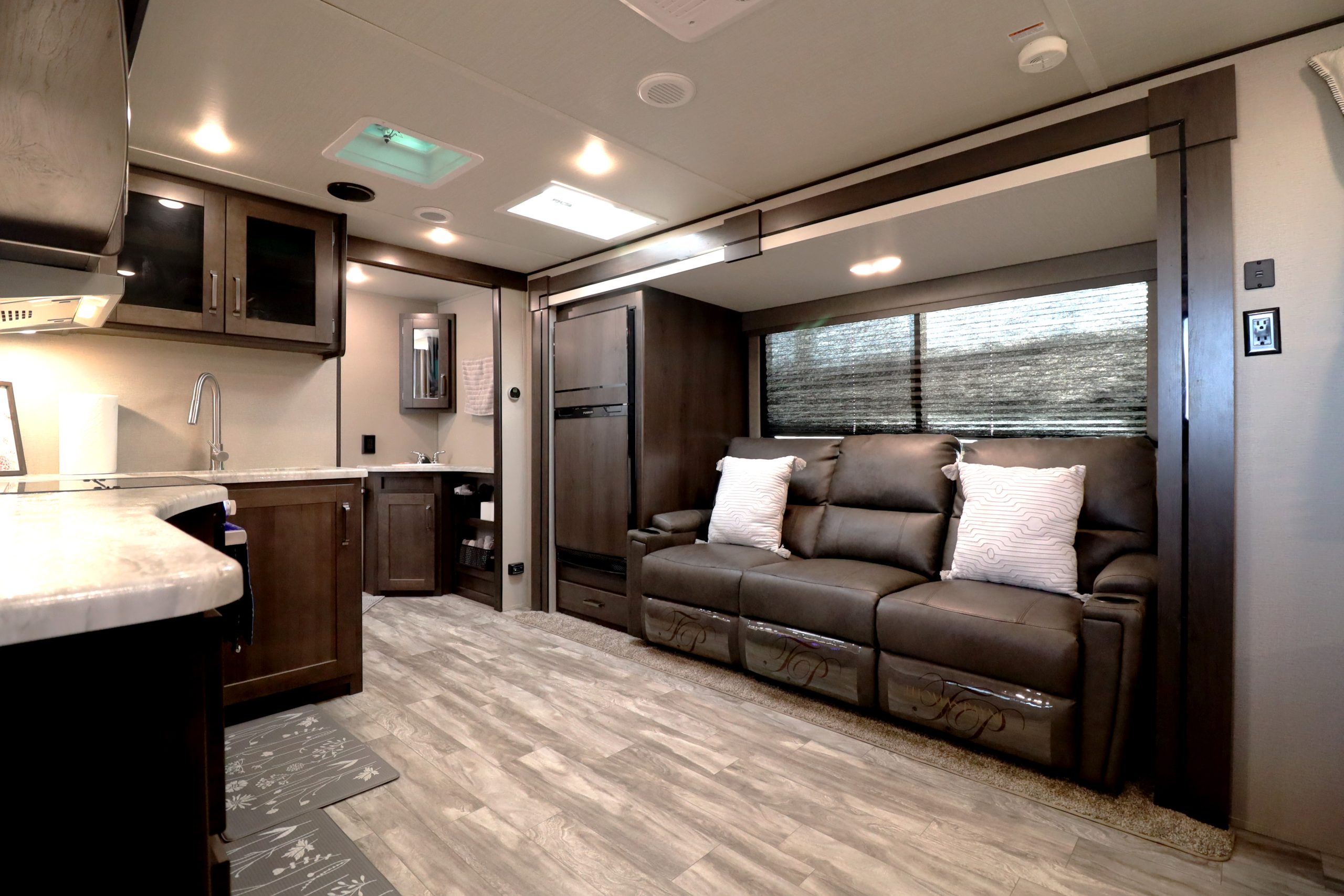 • End Your Day in Comfort After a day of activities, relax in the camper’s luxurious amenities with a super comfy convertible couch for lounging and relaxing.