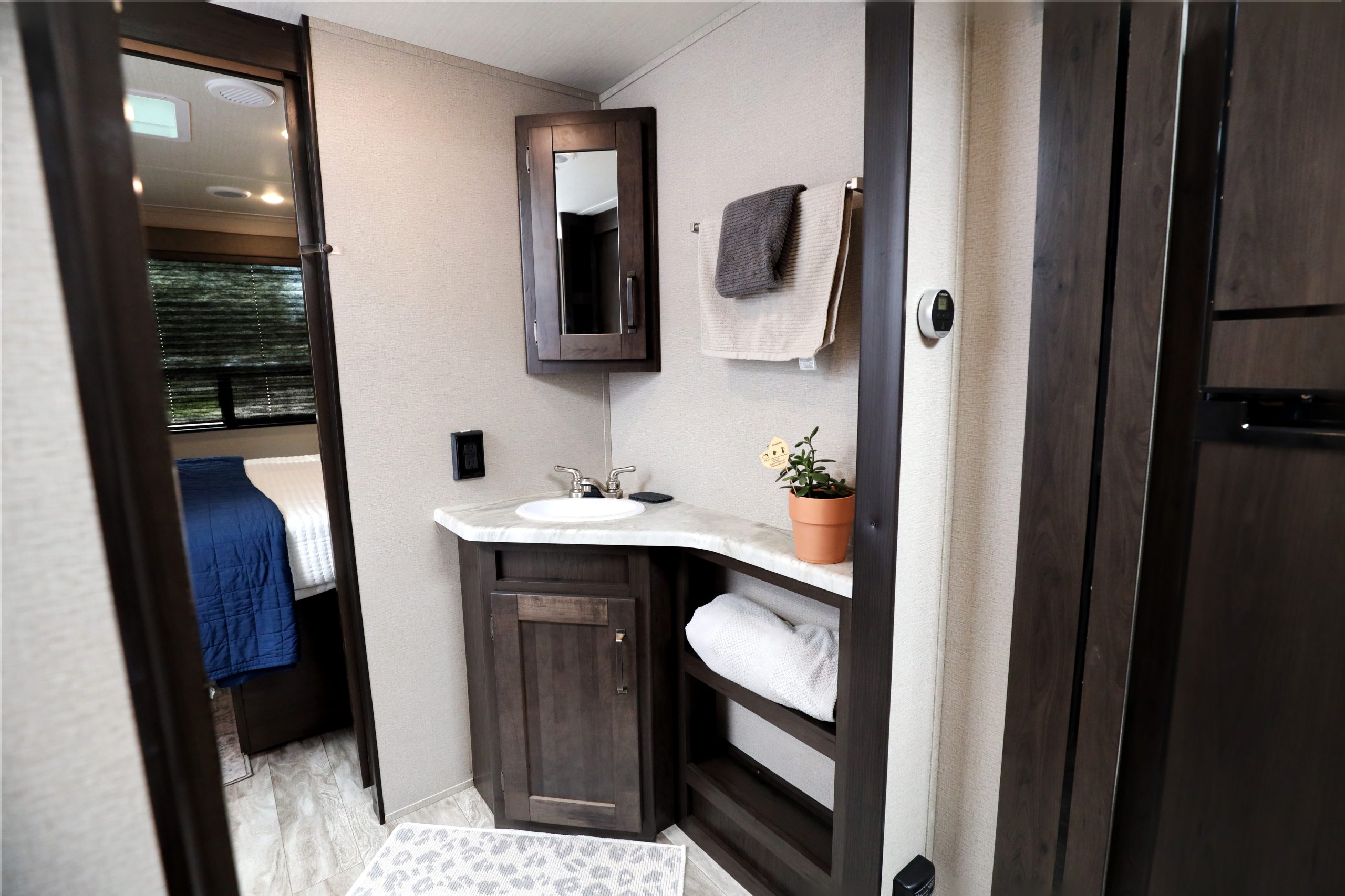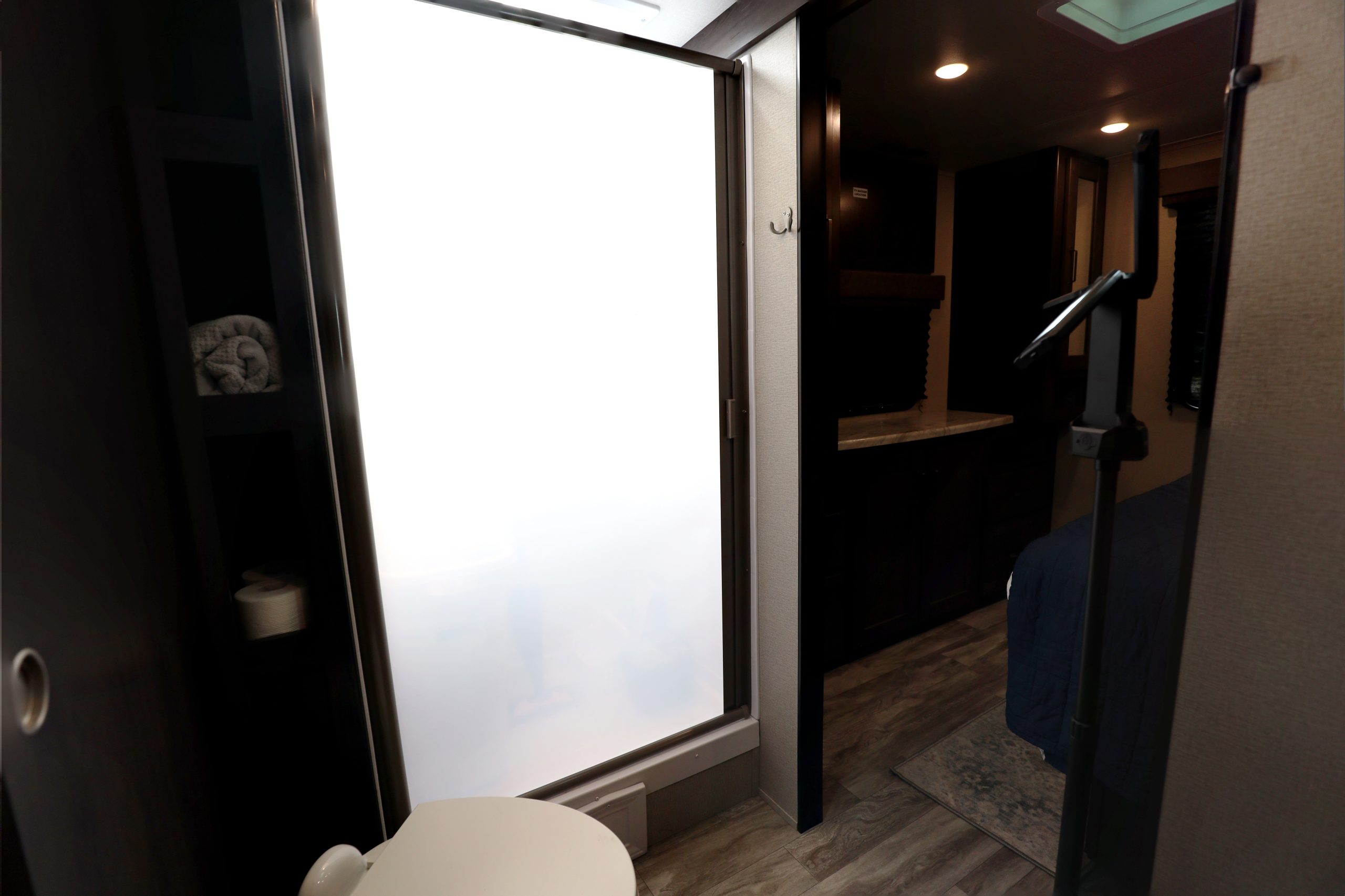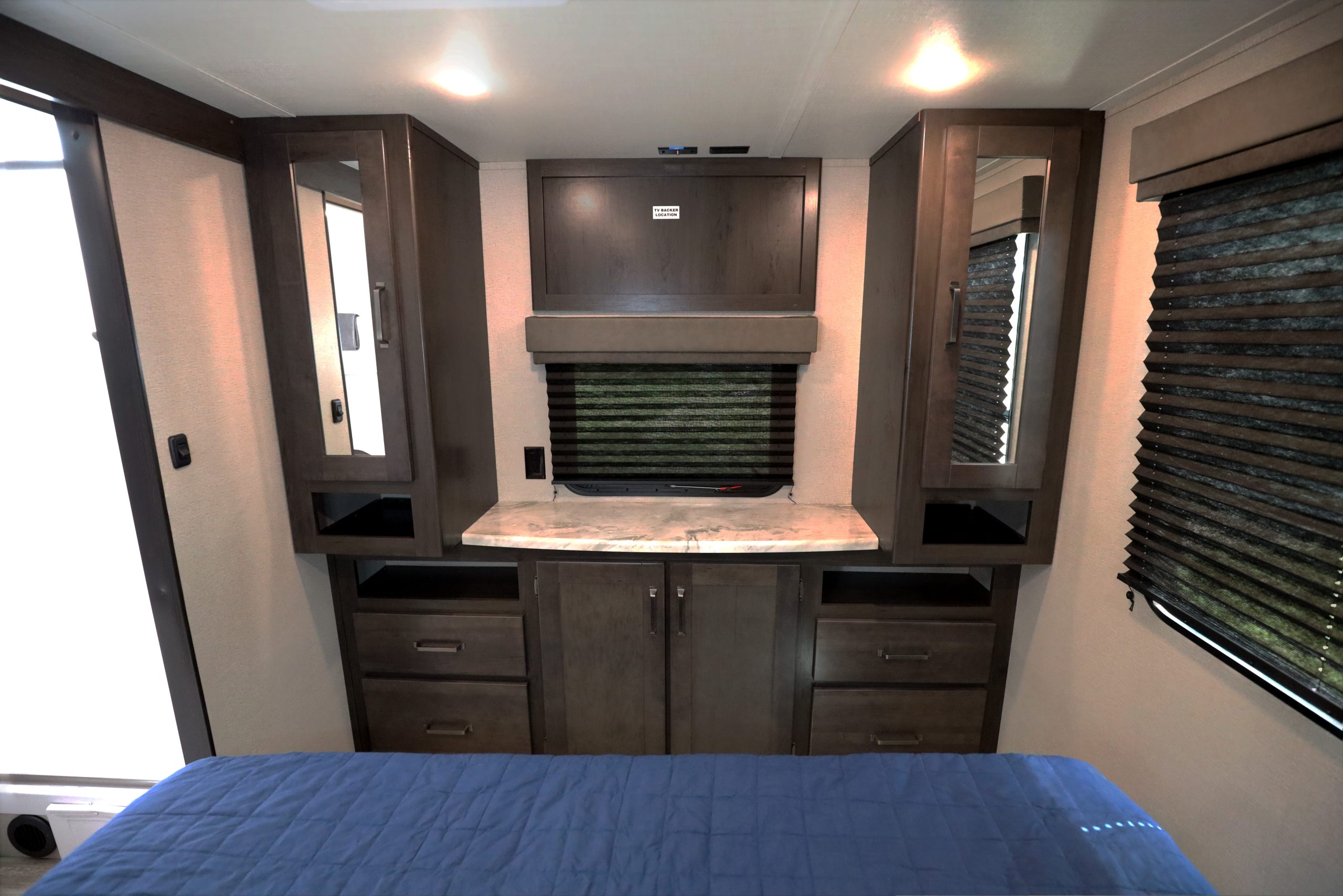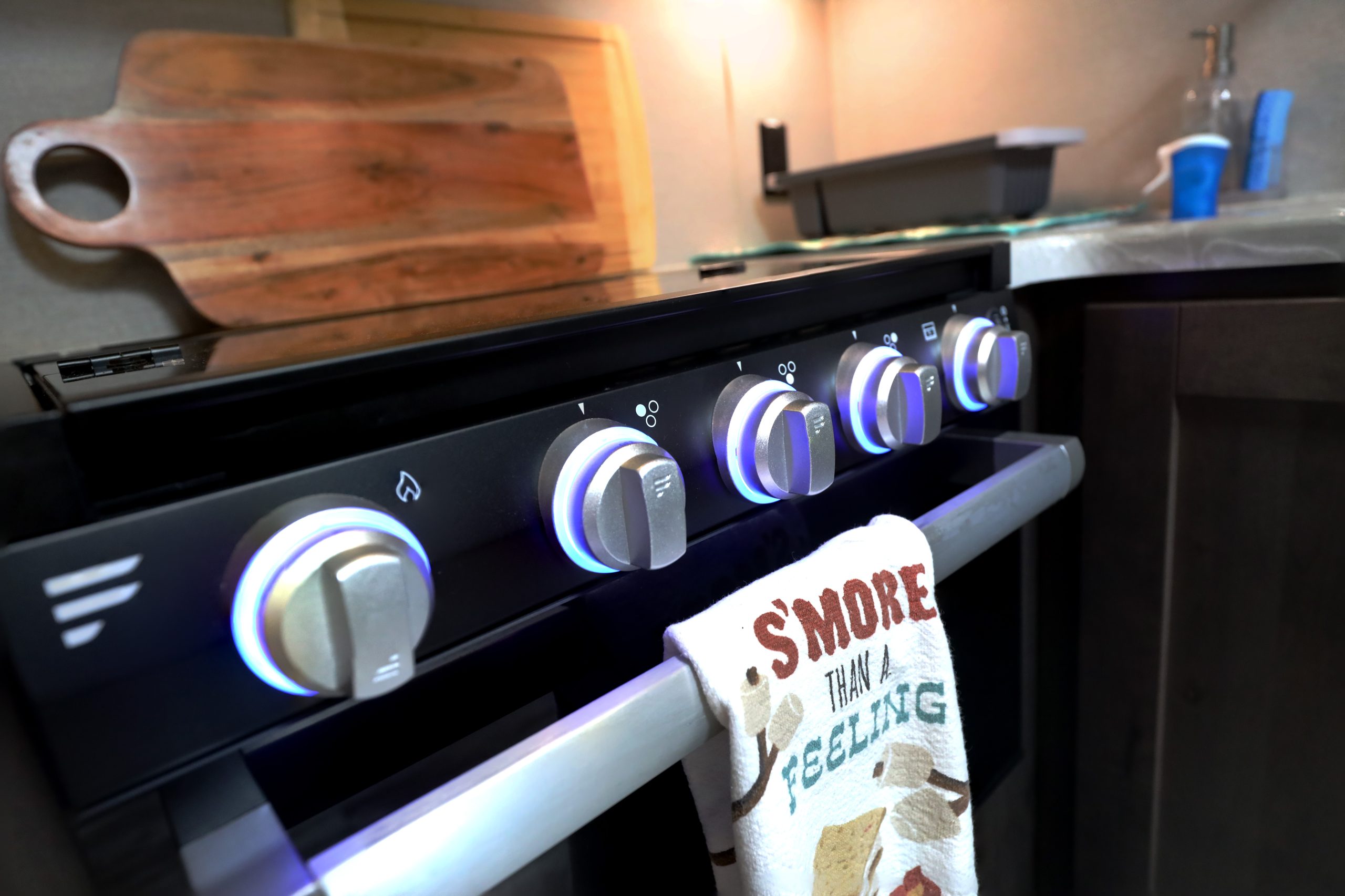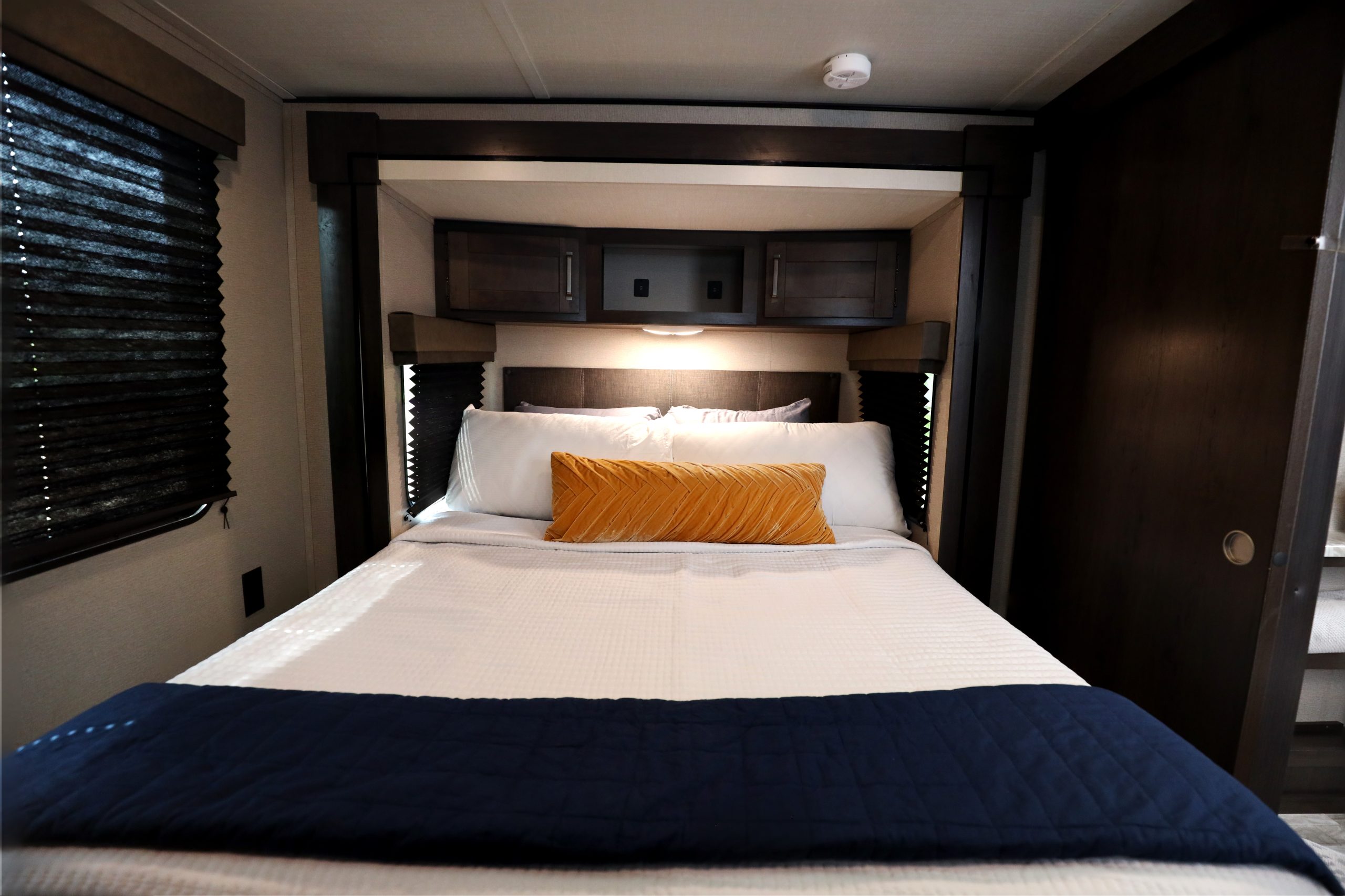 • End Your Day in Comfort After a day of activities, relax in the camper’s luxurious amenities with a super comfy convertible couch for lounging and relaxing.