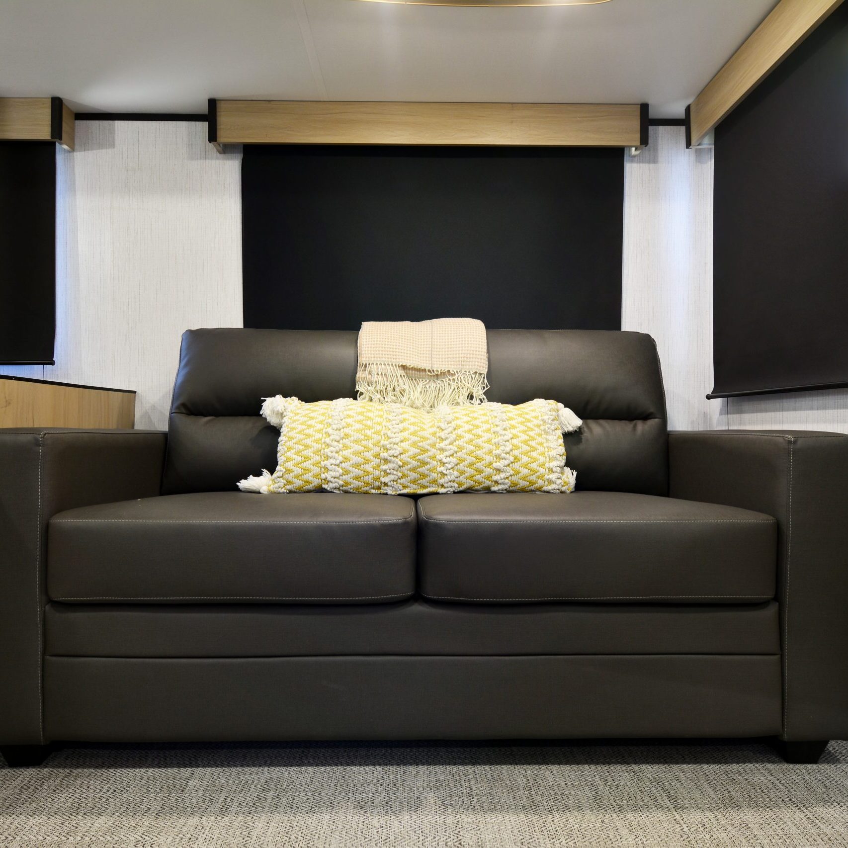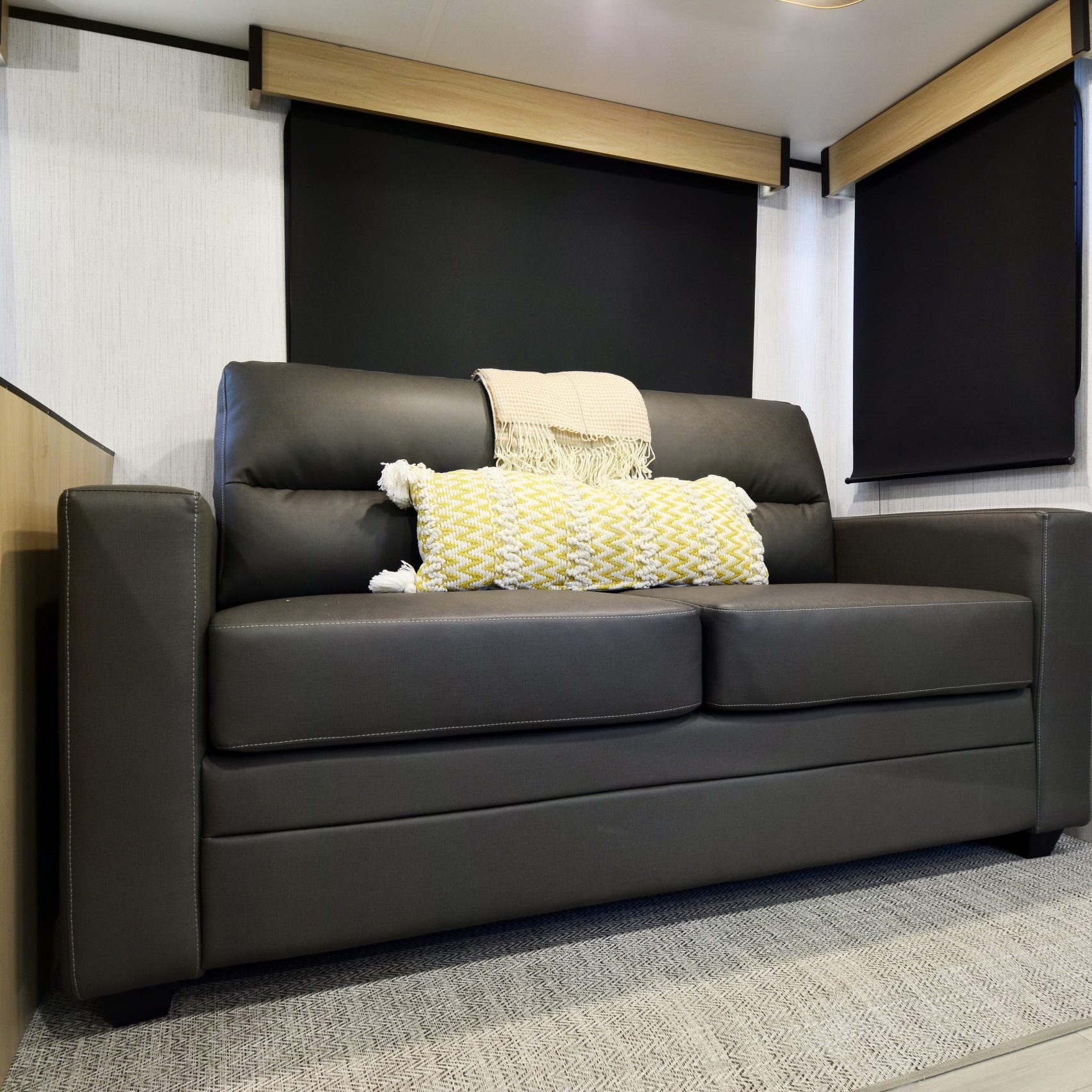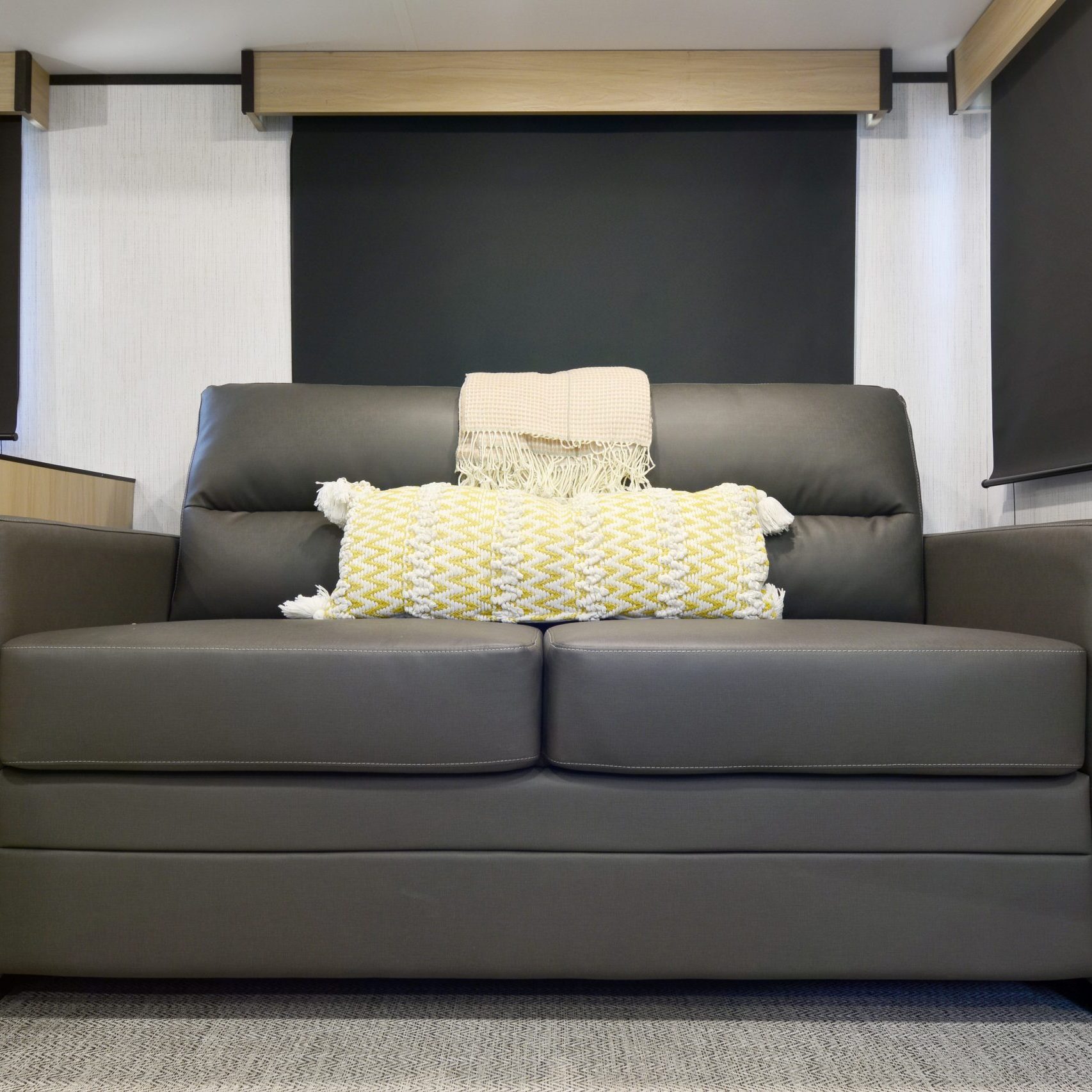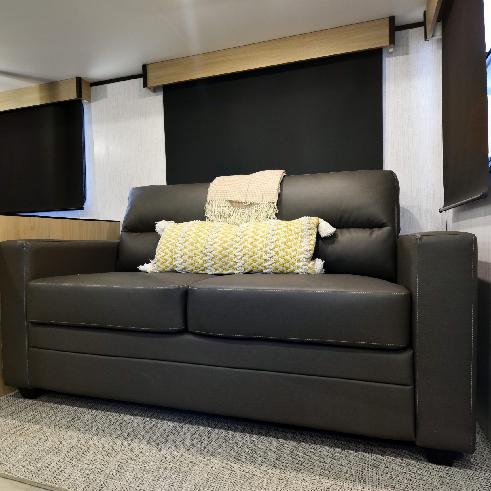 - End Your Day in Comfort After a day of activities, relax in the camper’s luxurious amenities with a super comfy convertible couch for lounging and relaxing.