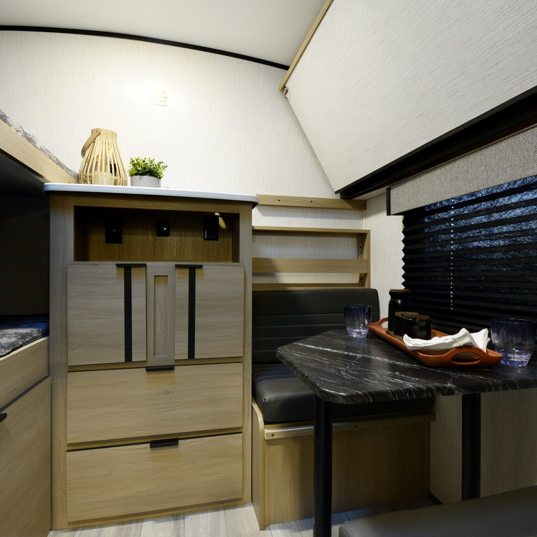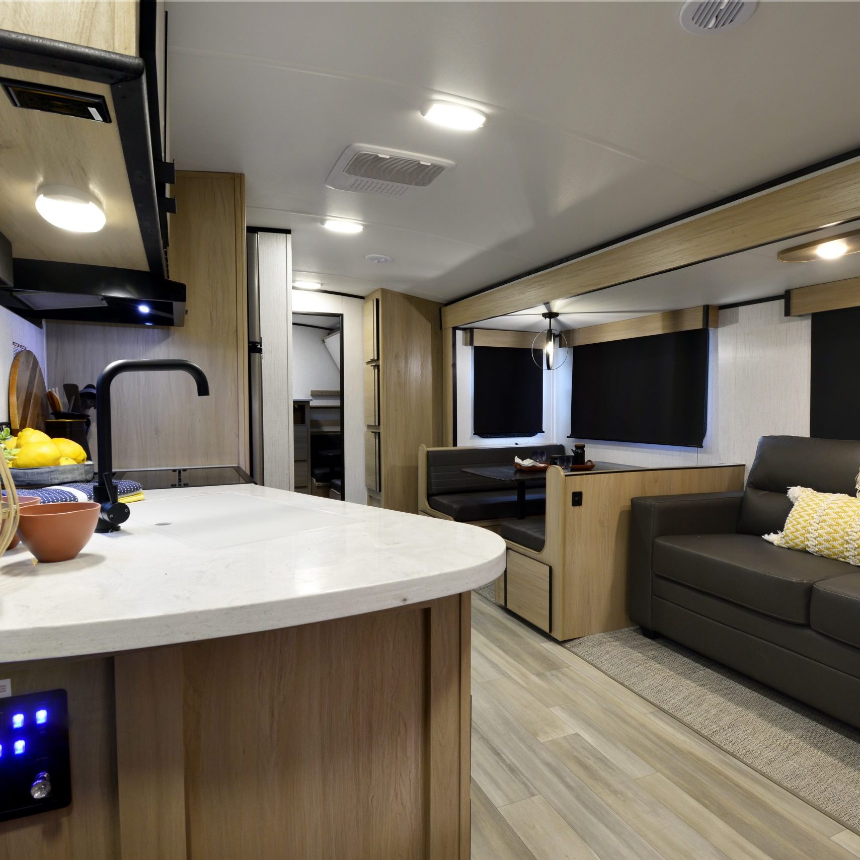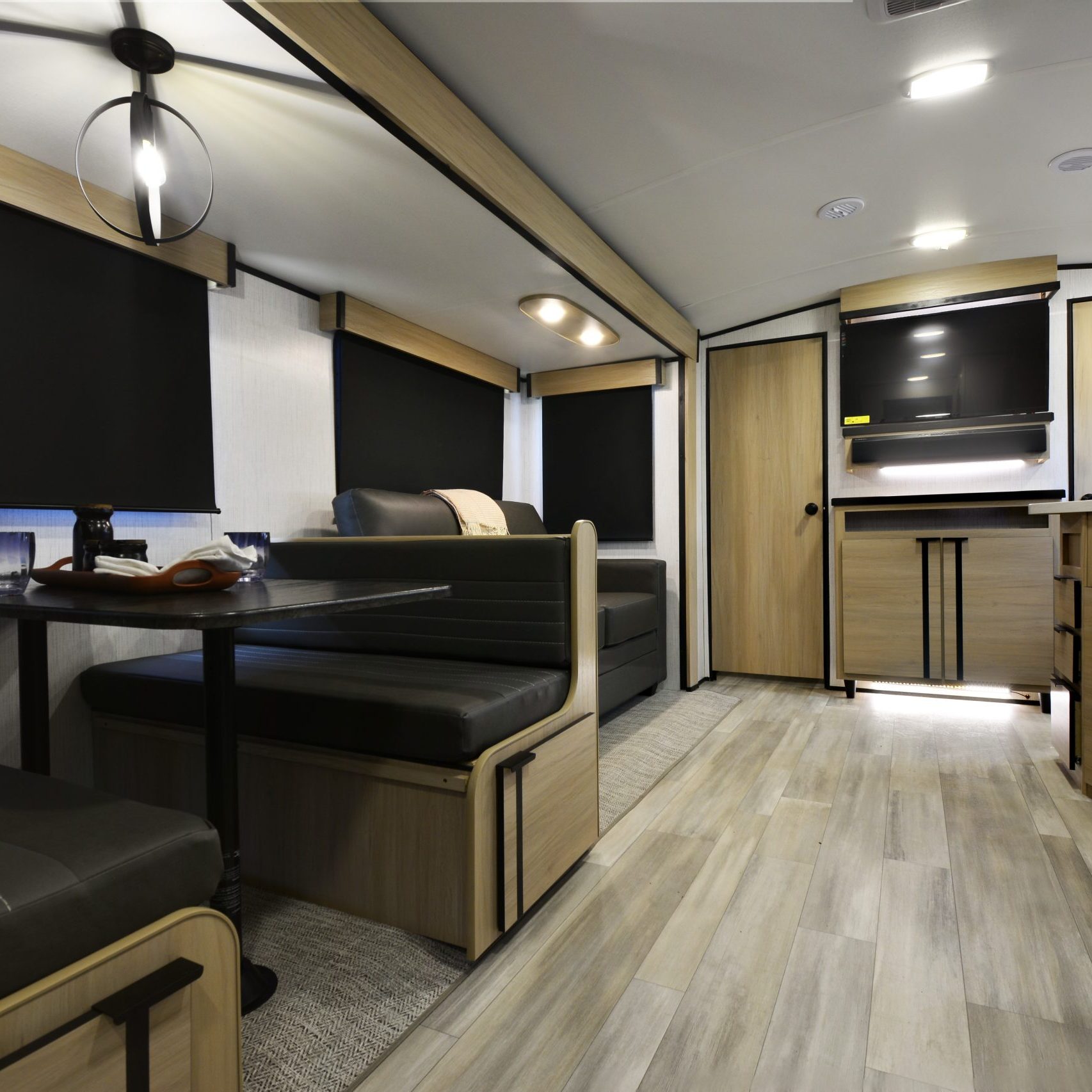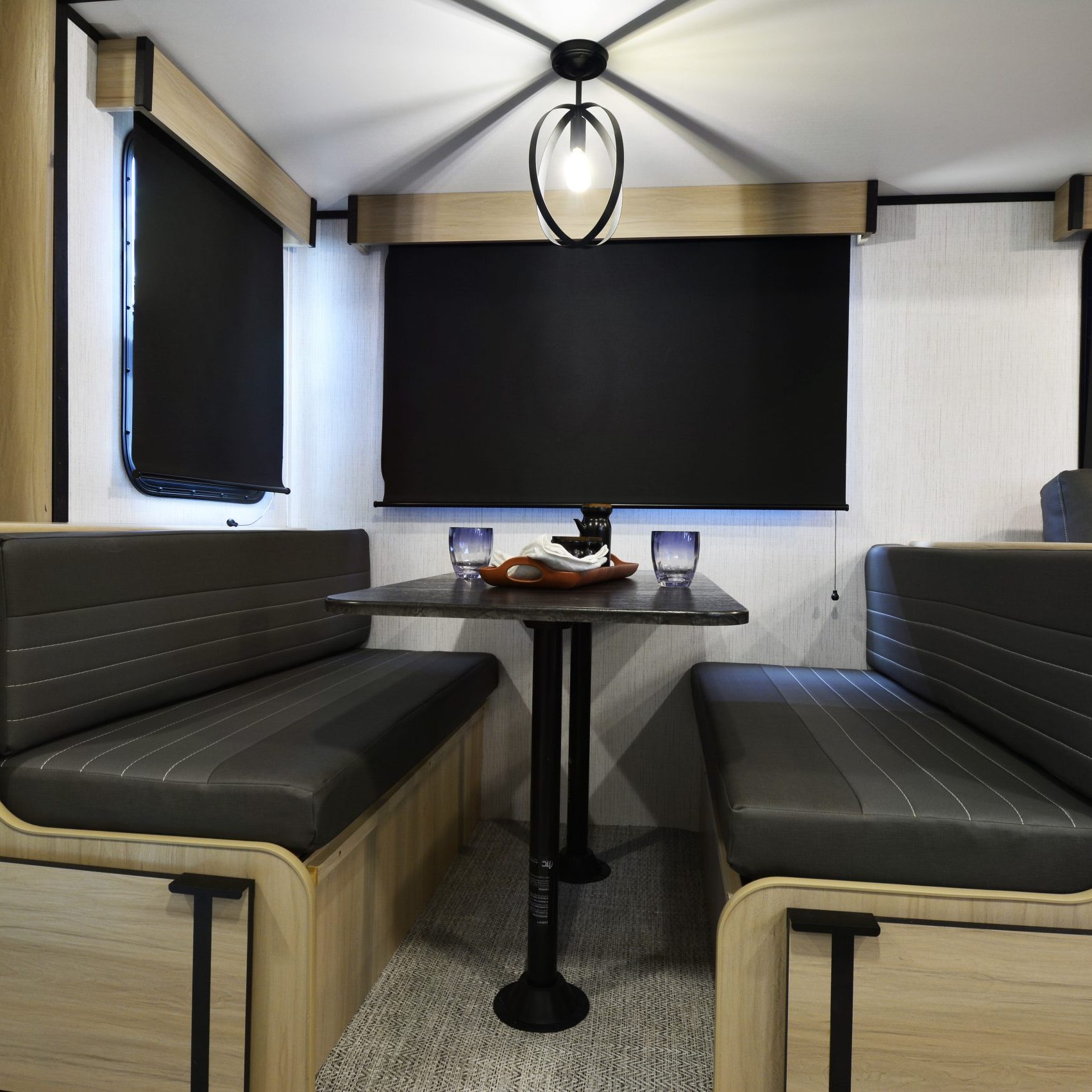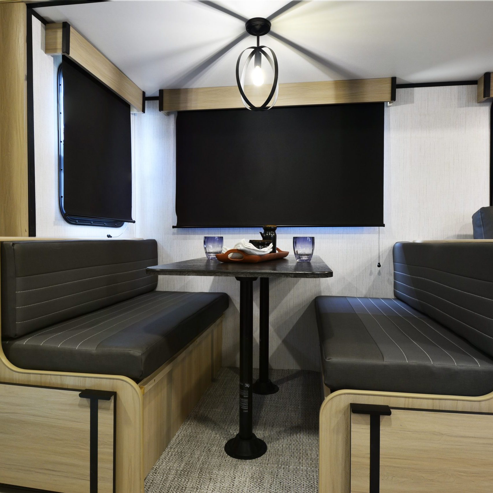 - End Your Day in Comfort After a day of activities, relax in the camper’s luxurious amenities with a super comfy convertible couch for lounging and relaxing.
