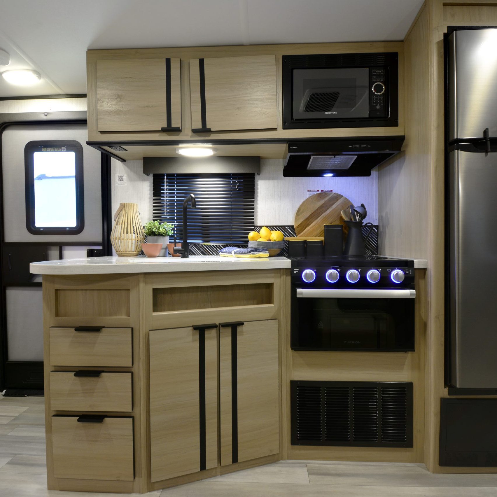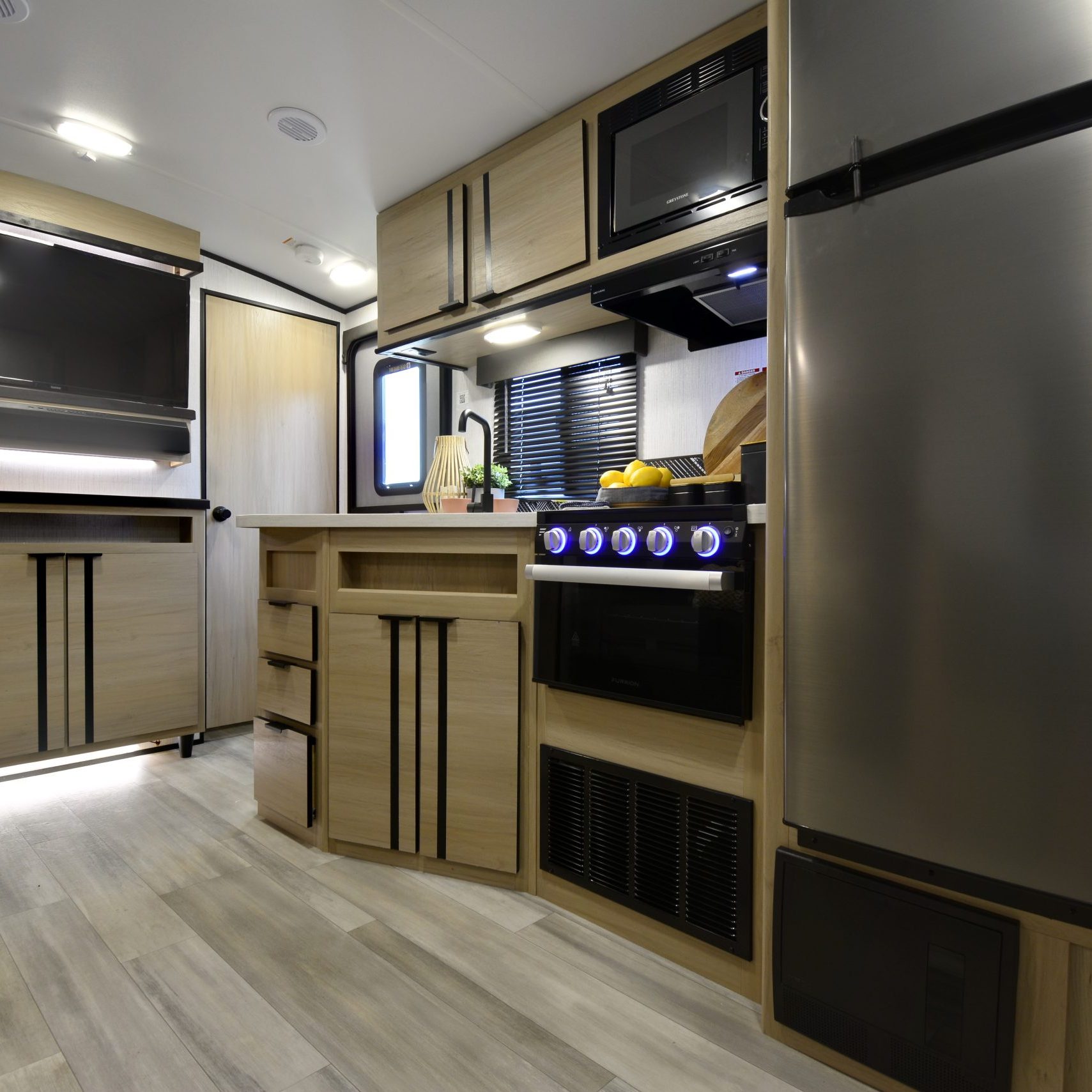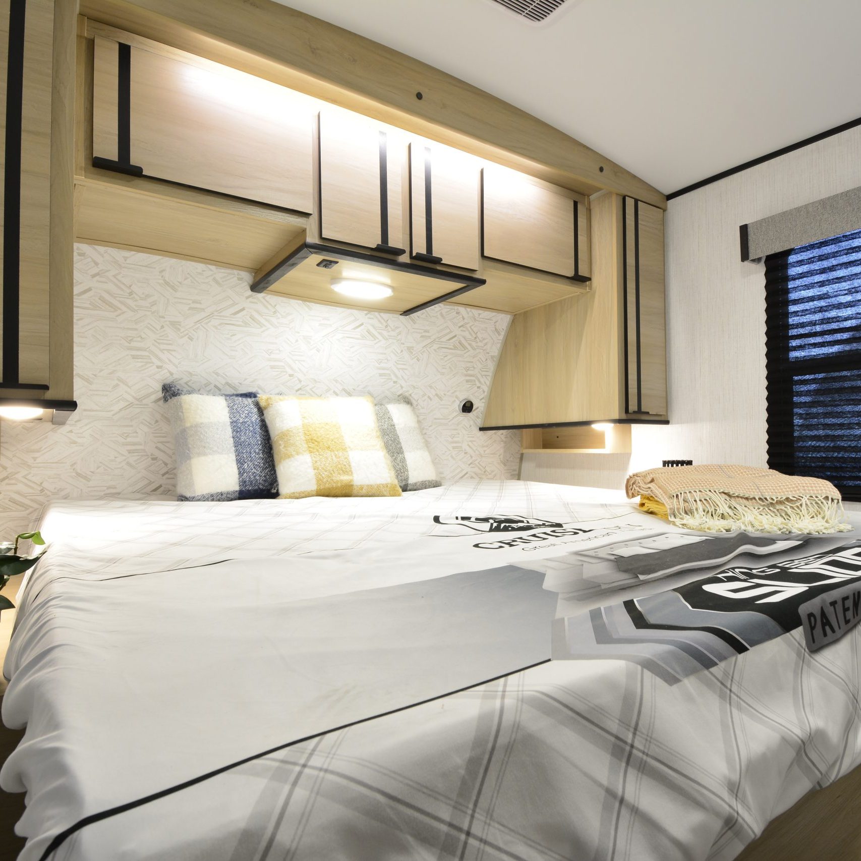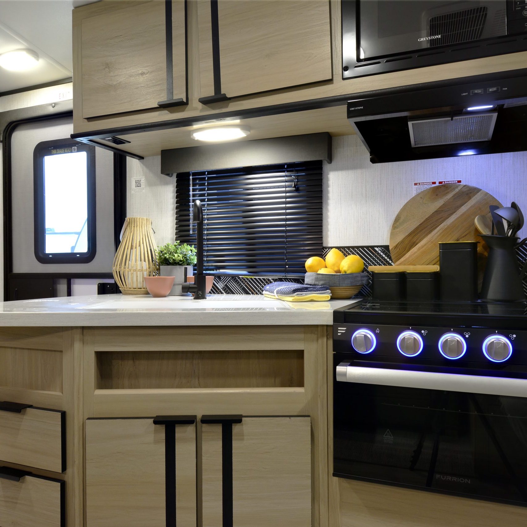 - End Your Day in Comfort After a day of activities, relax in the camper’s luxurious amenities with a super comfy convertible couch for lounging and relaxing.
