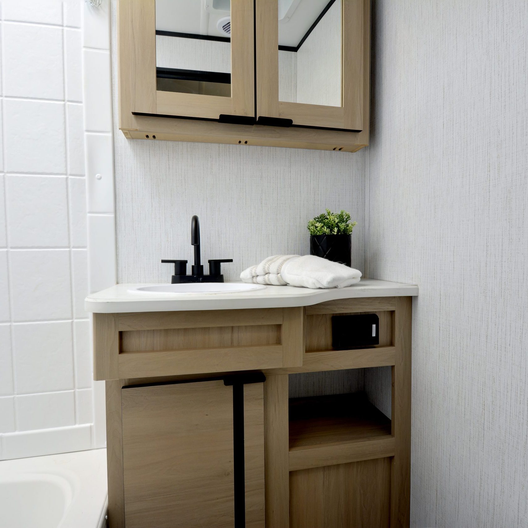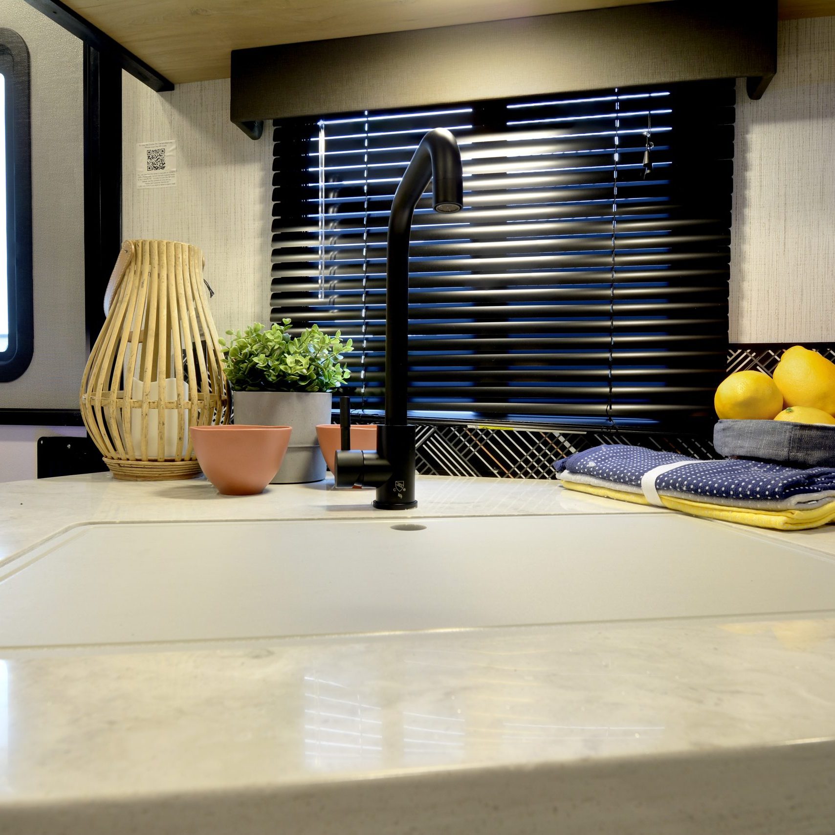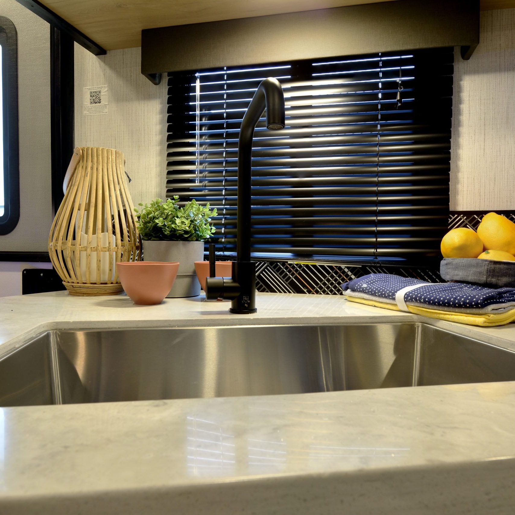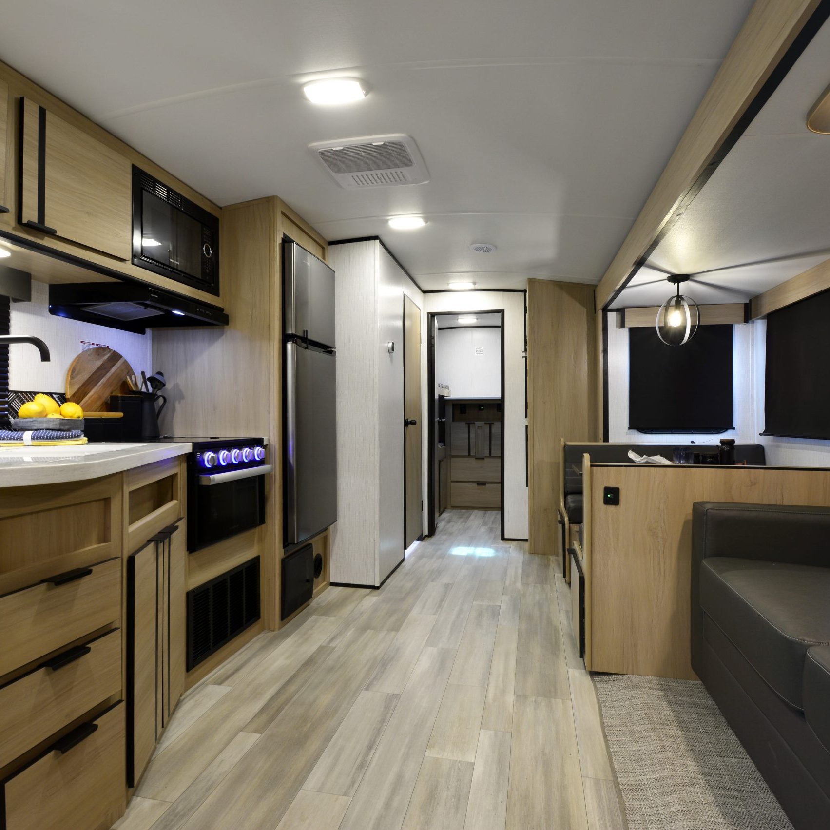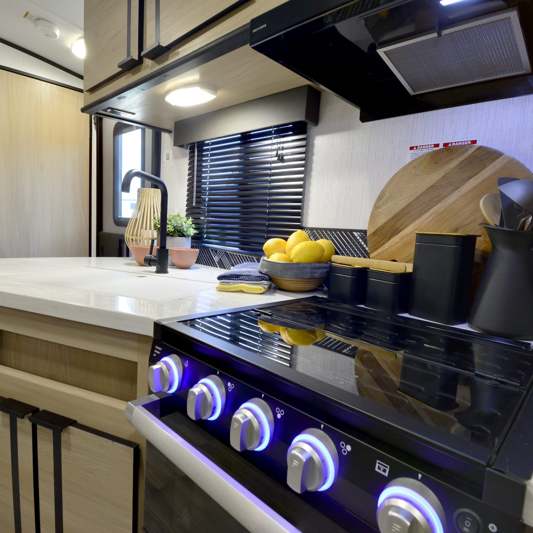 - End Your Day in Comfort After a day of activities, relax in the camper’s luxurious amenities with a super comfy convertible couch for lounging and relaxing.