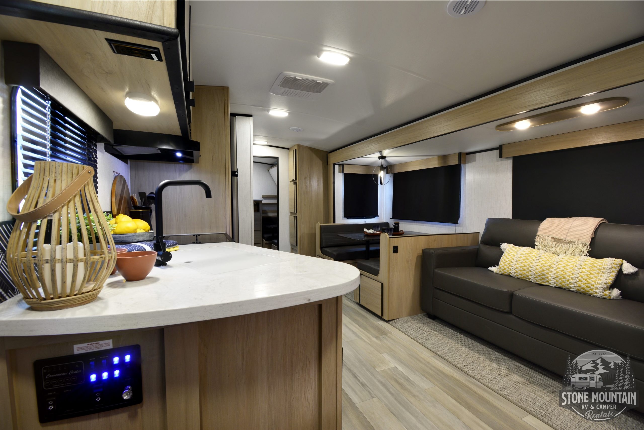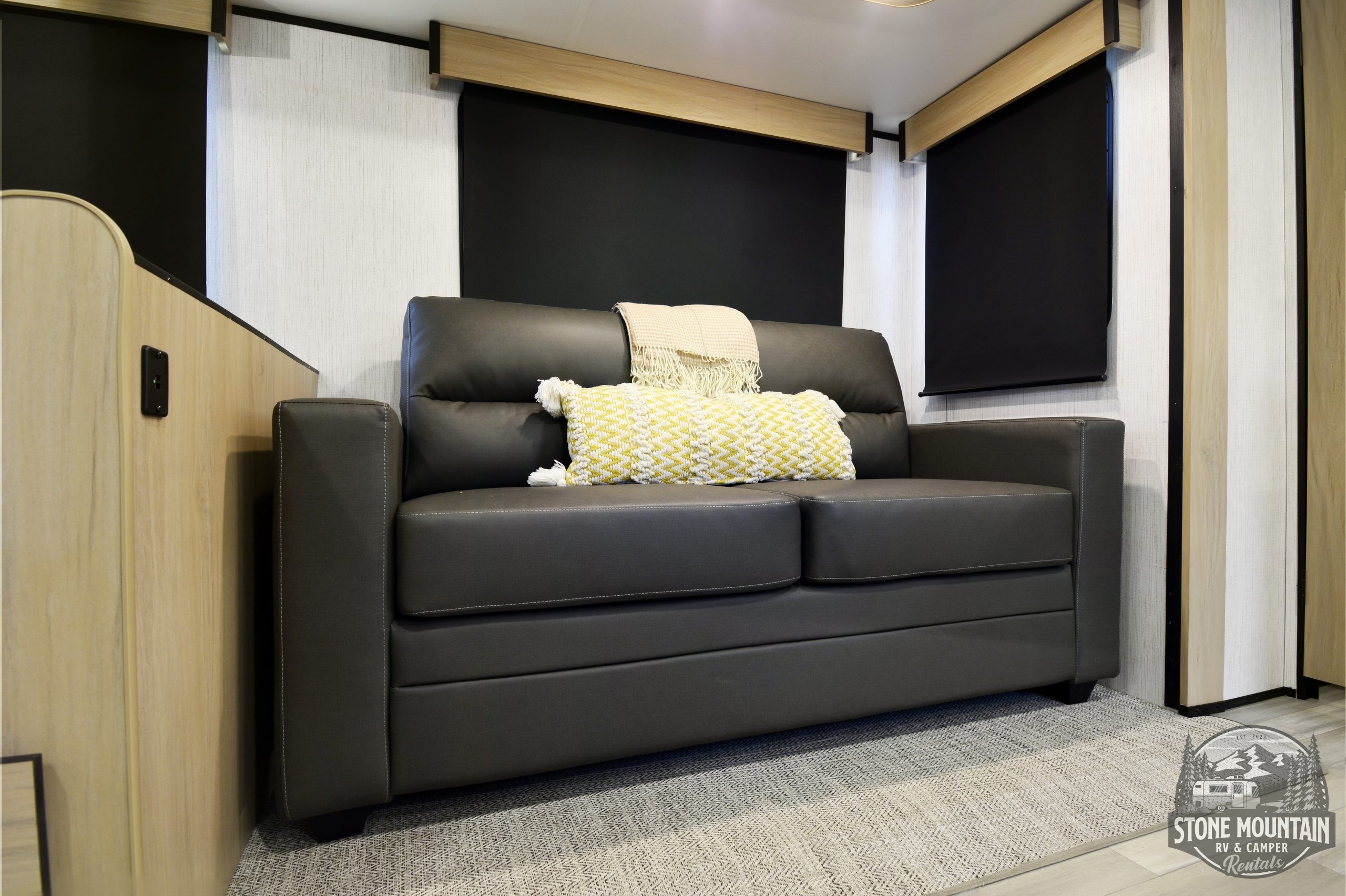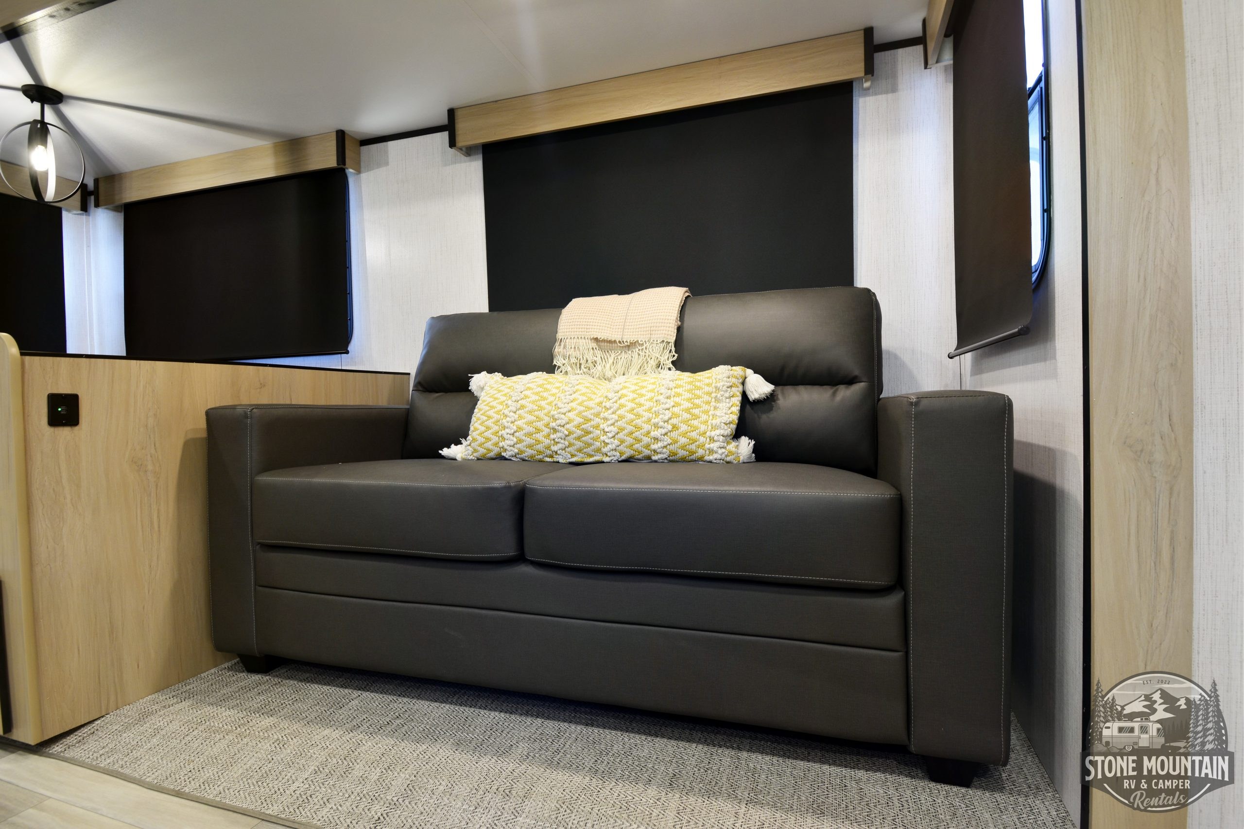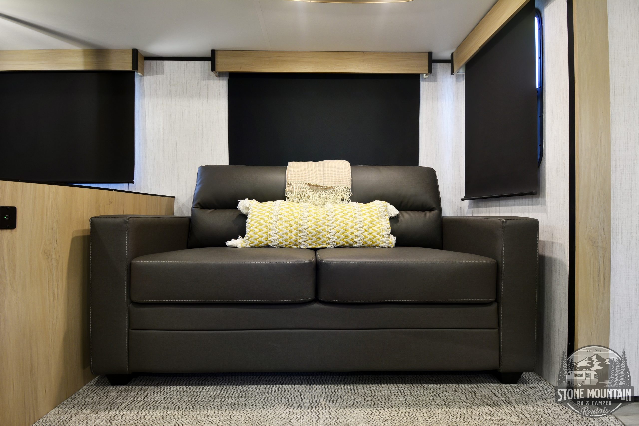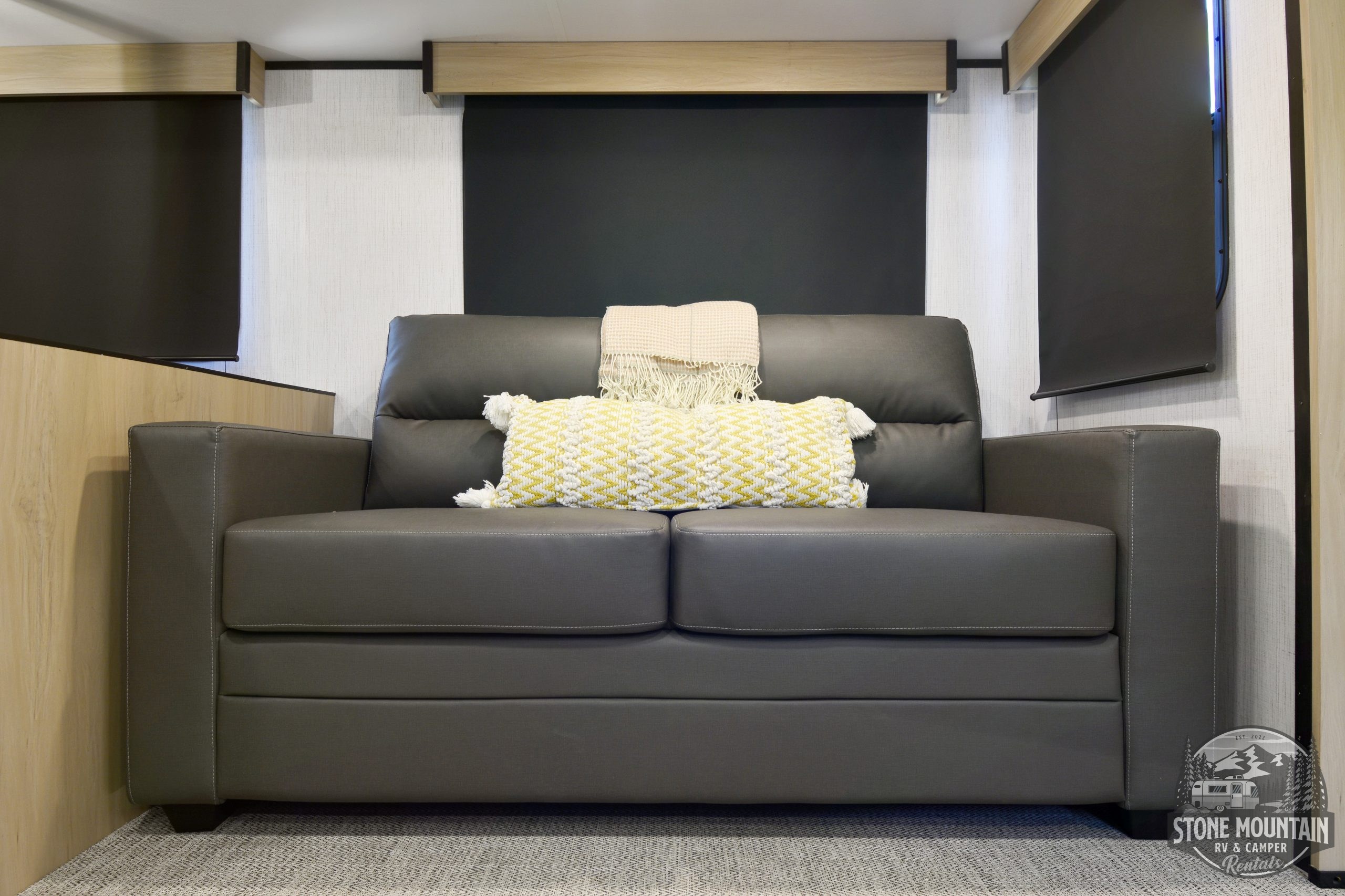 - End Your Day in Comfort After a day of activities, relax in the camper’s luxurious amenities with a super comfy convertible couch for lounging and relaxing.