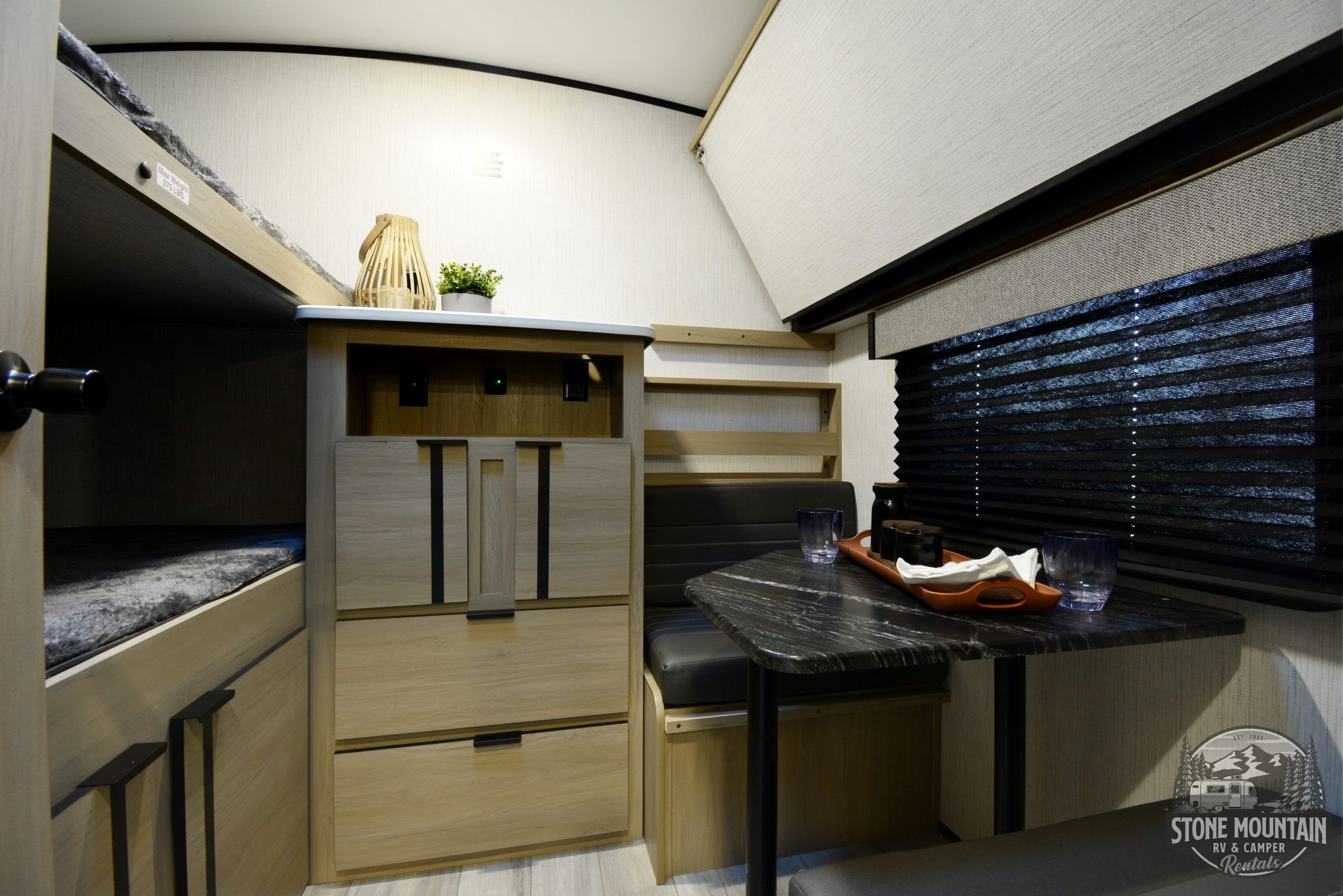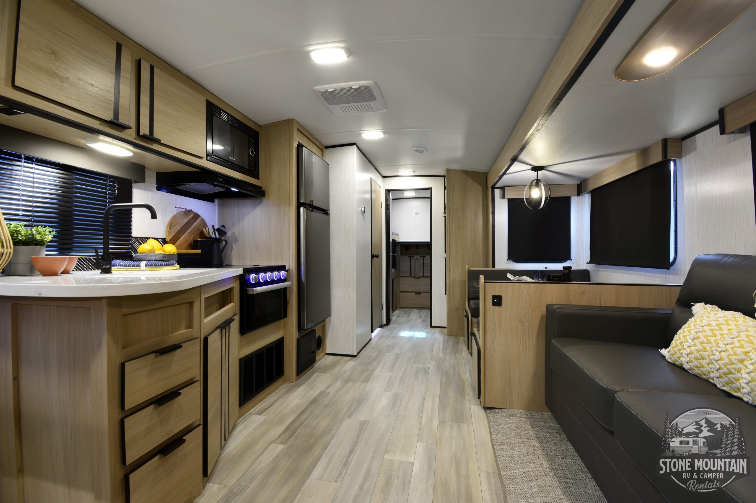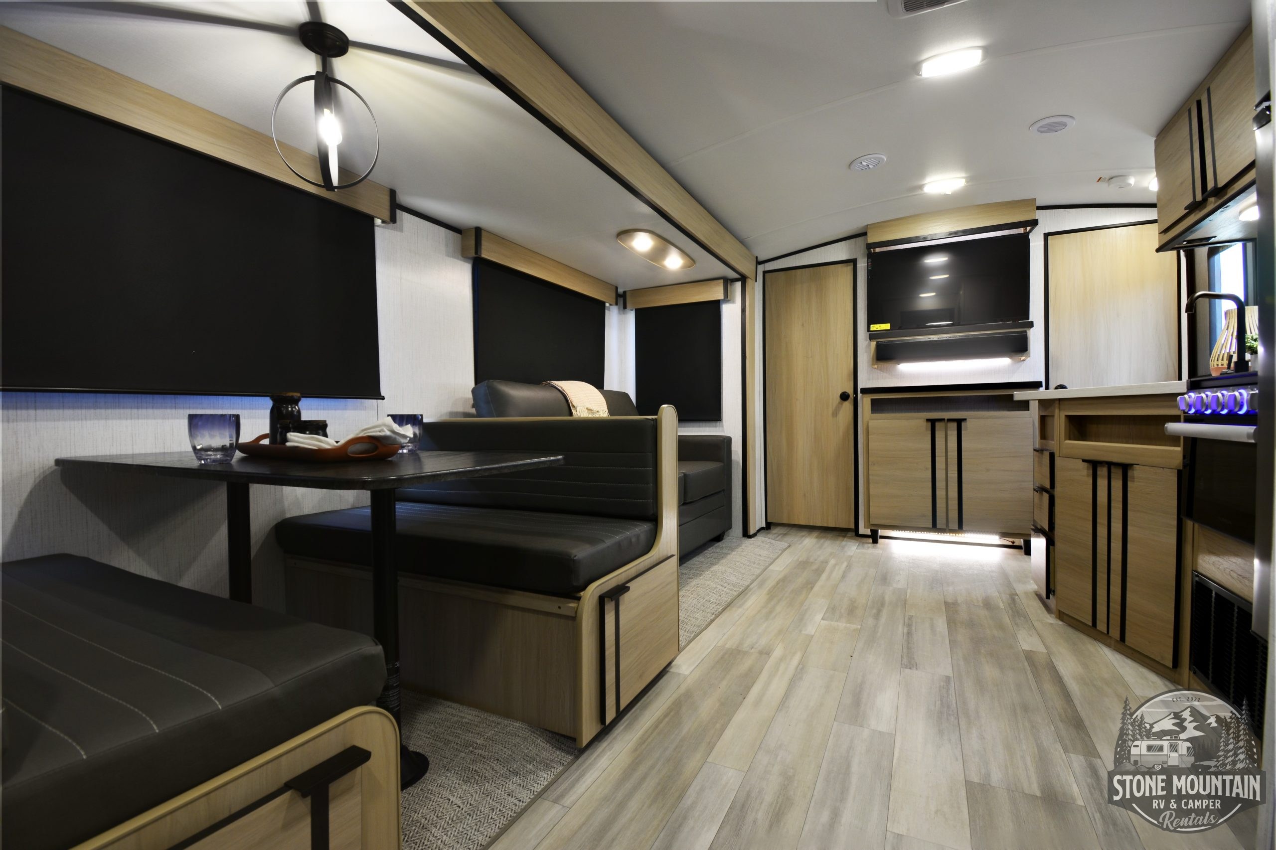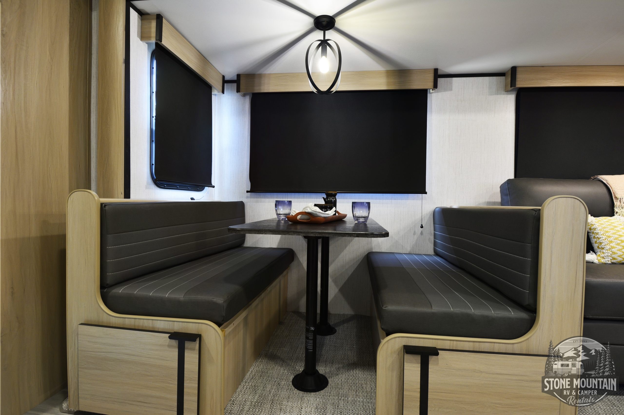 - End Your Day in Comfort After a day of activities, relax in the camper’s luxurious amenities with a super comfy convertible couch for lounging and relaxing.