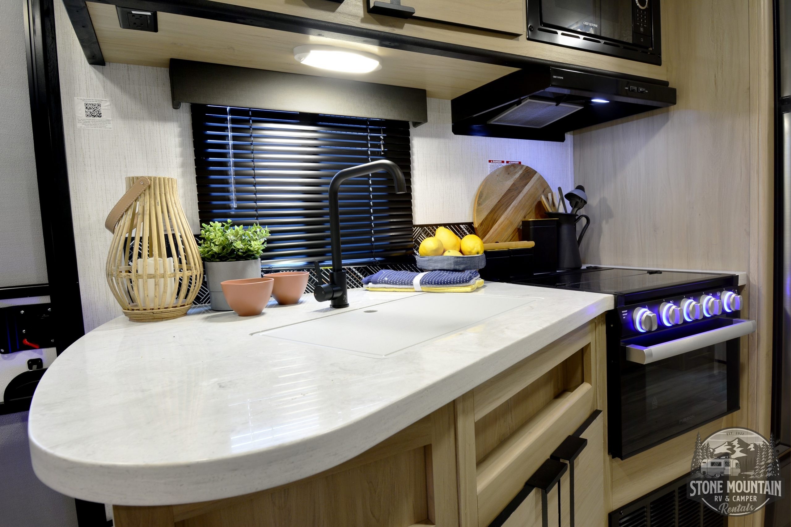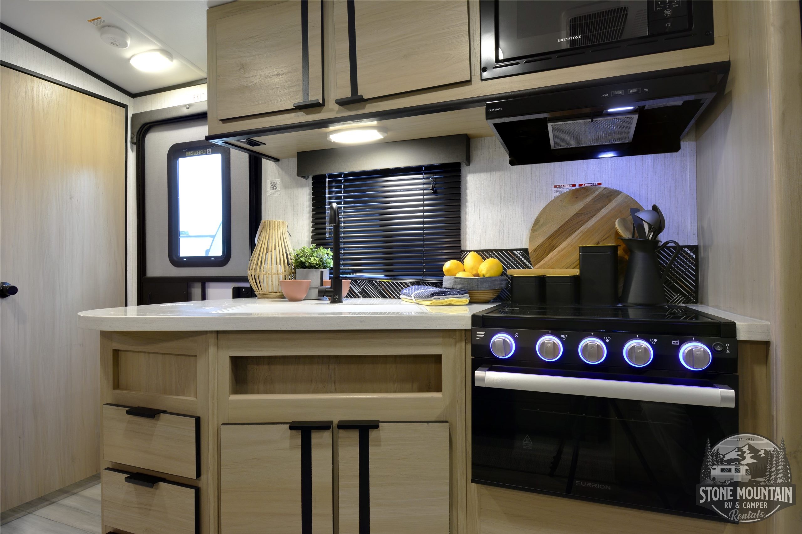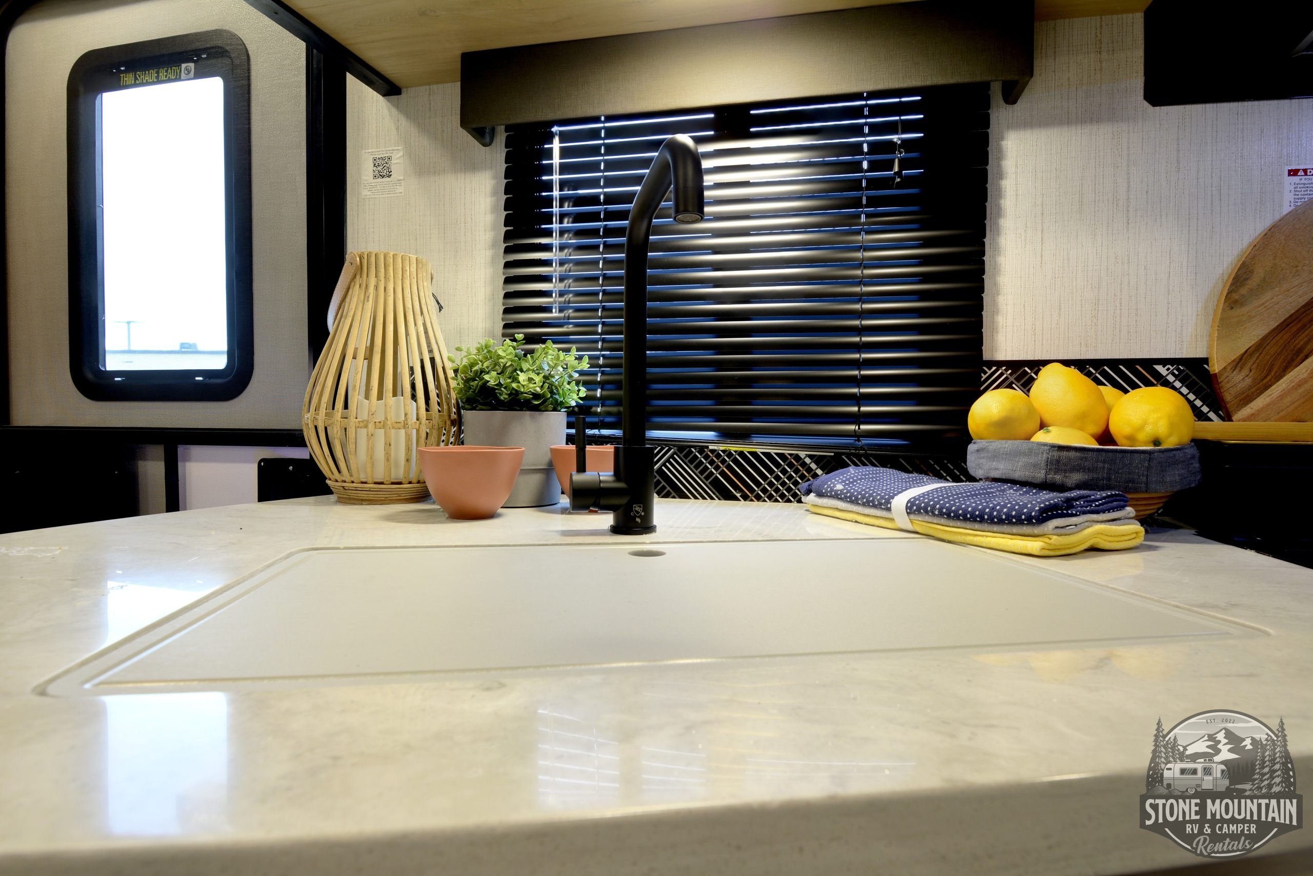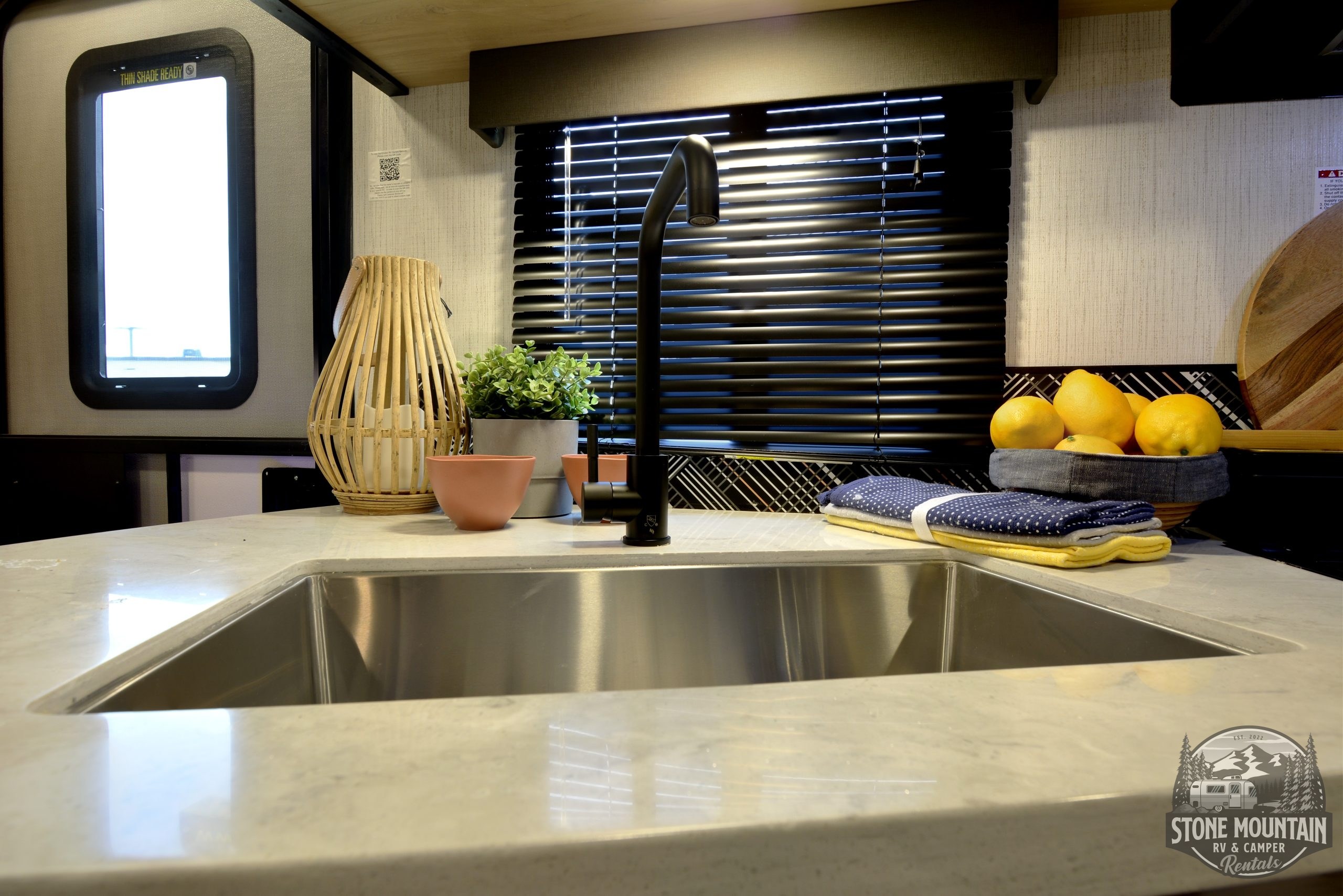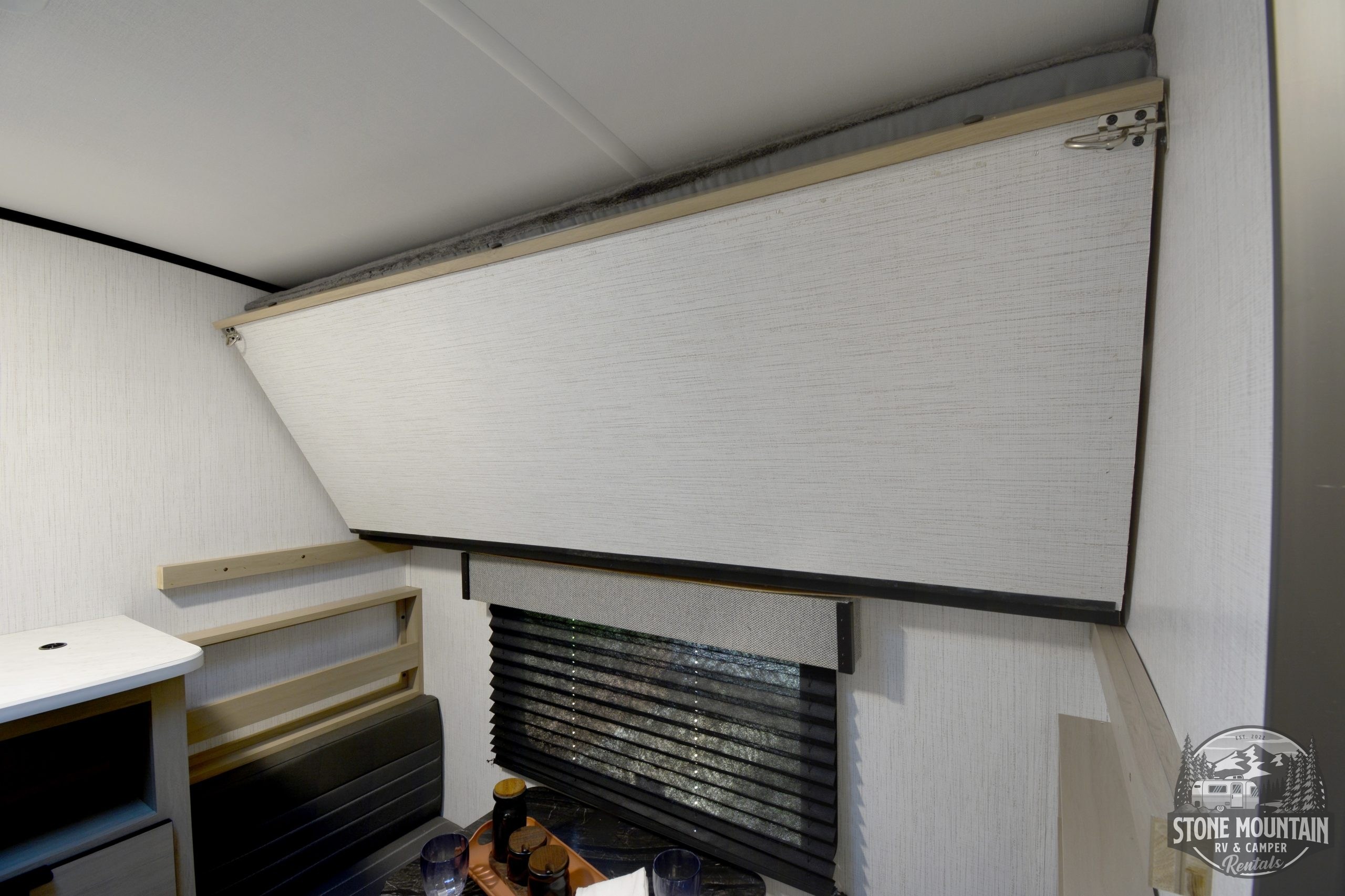 - End Your Day in Comfort After a day of activities, relax in the camper’s luxurious amenities with a super comfy convertible couch for lounging and relaxing.
