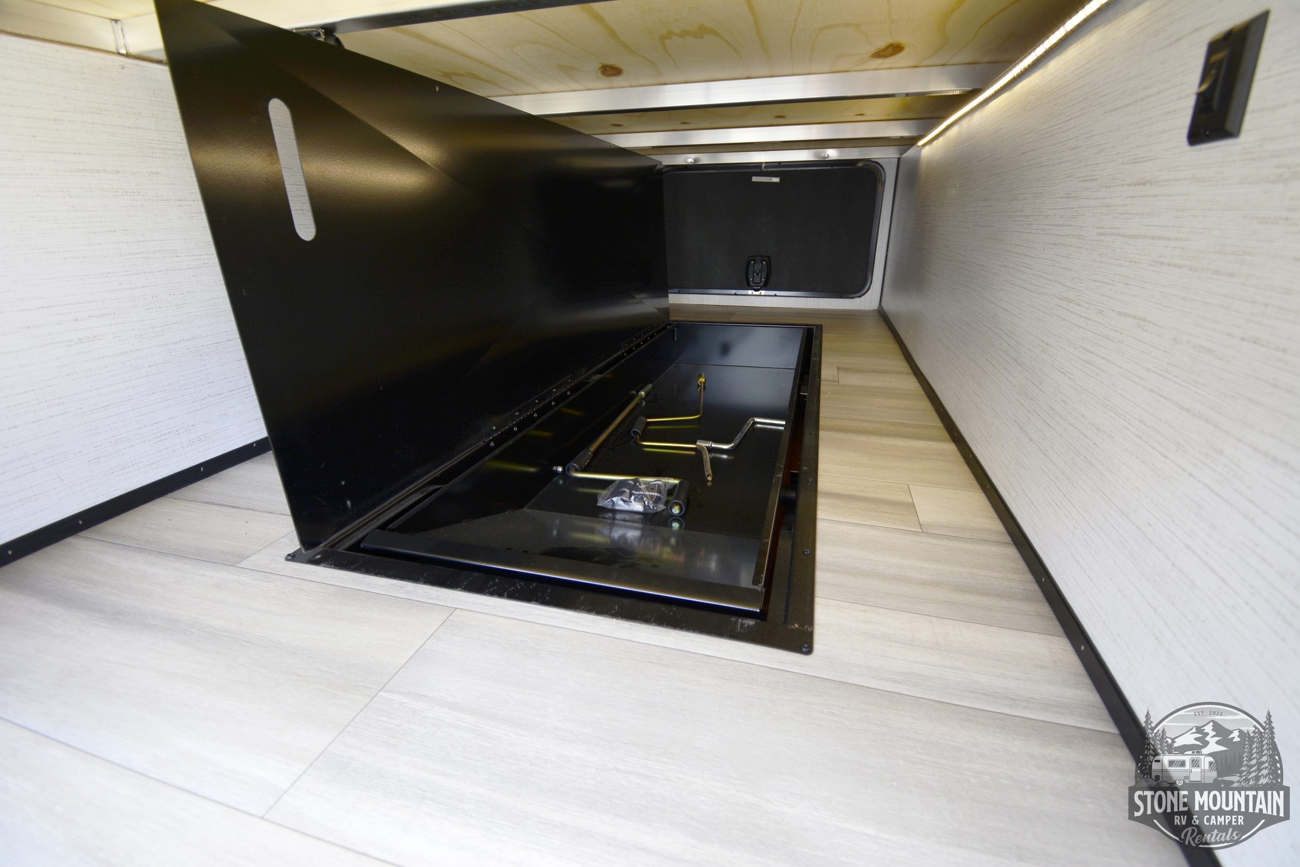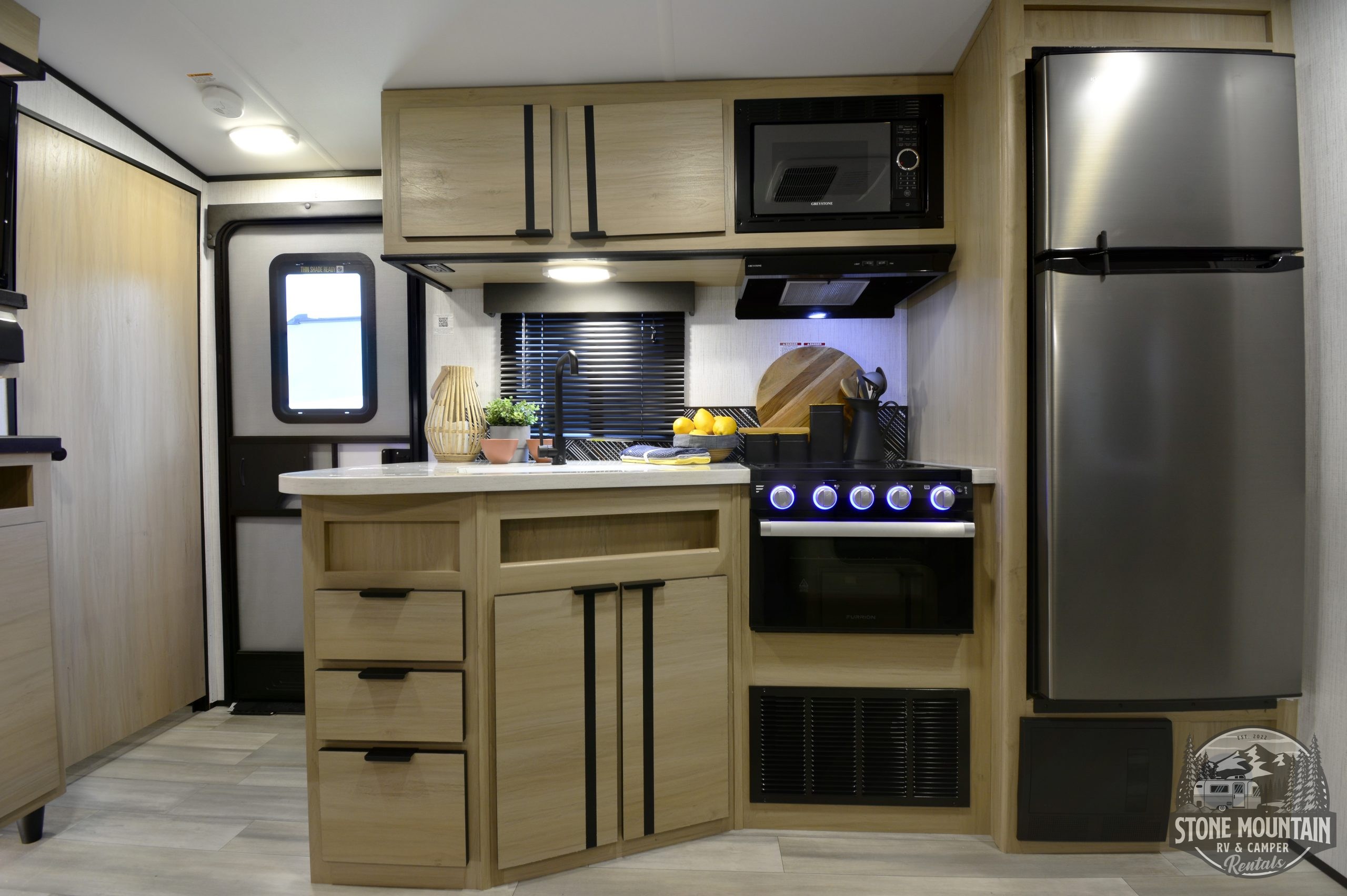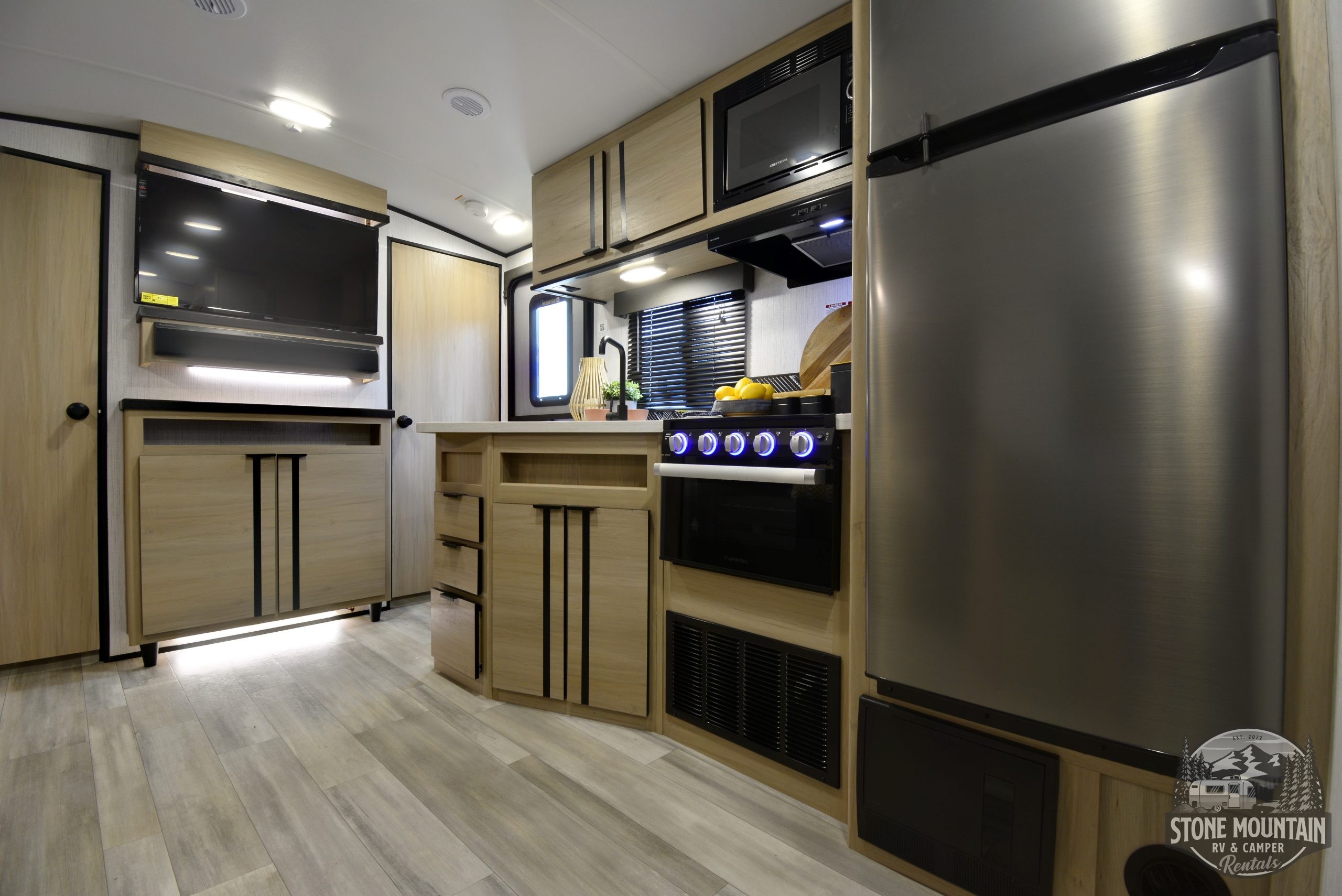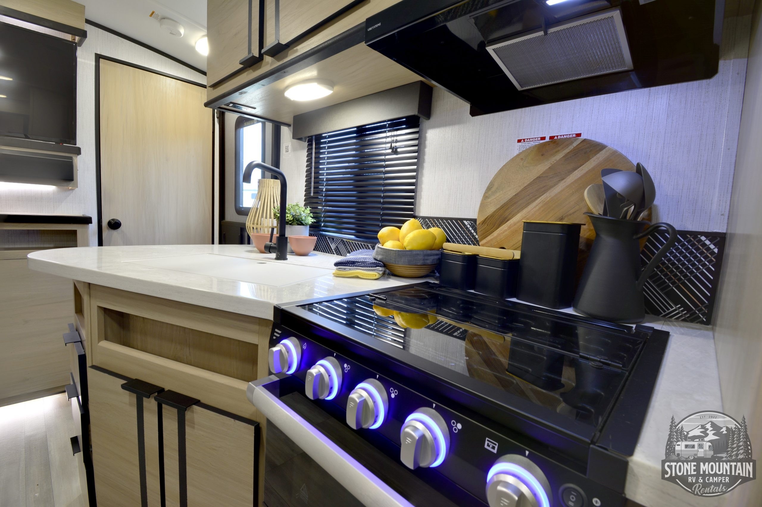 - End Your Day in Comfort After a day of activities, relax in the camper’s luxurious amenities with a super comfy convertible couch for lounging and relaxing.