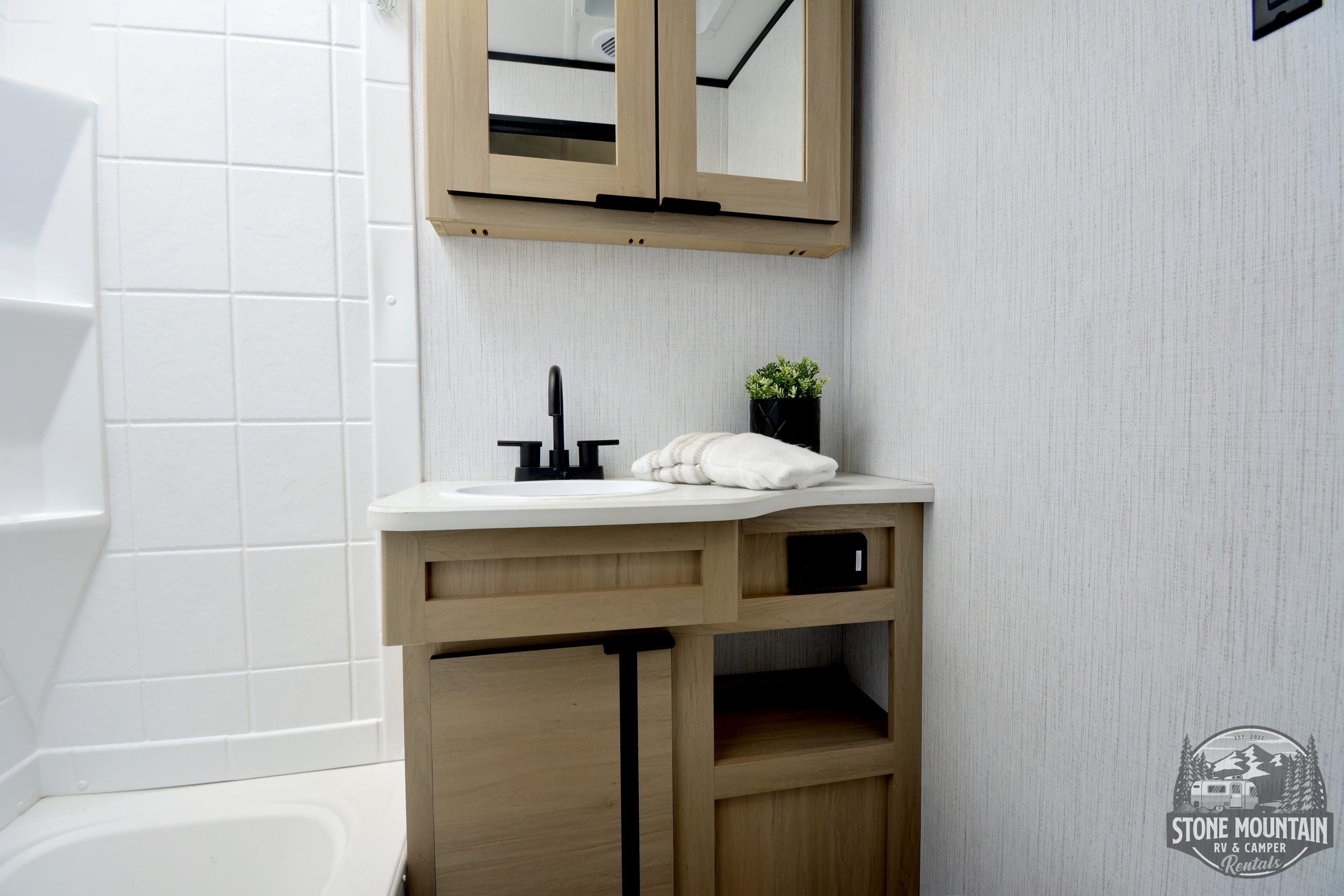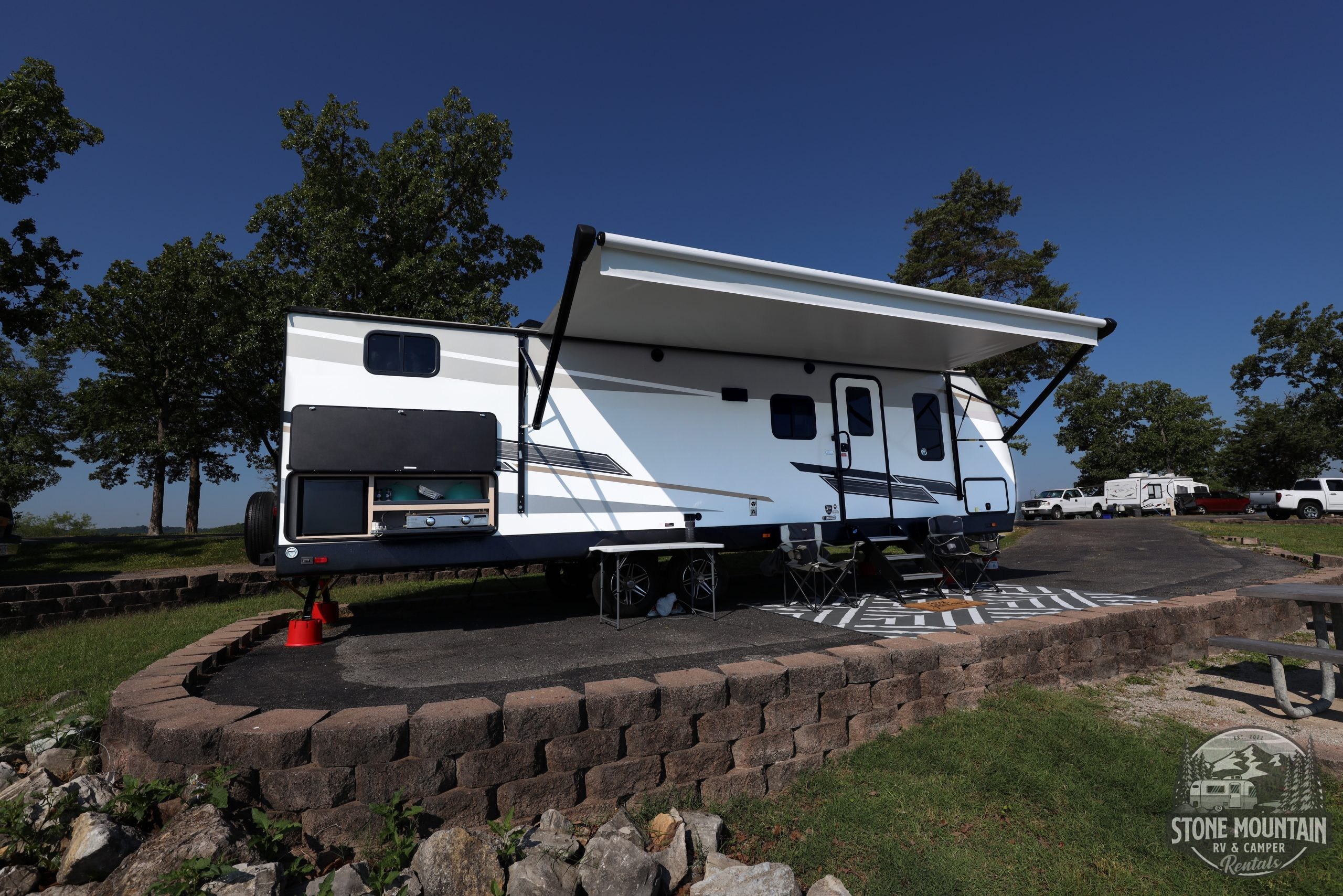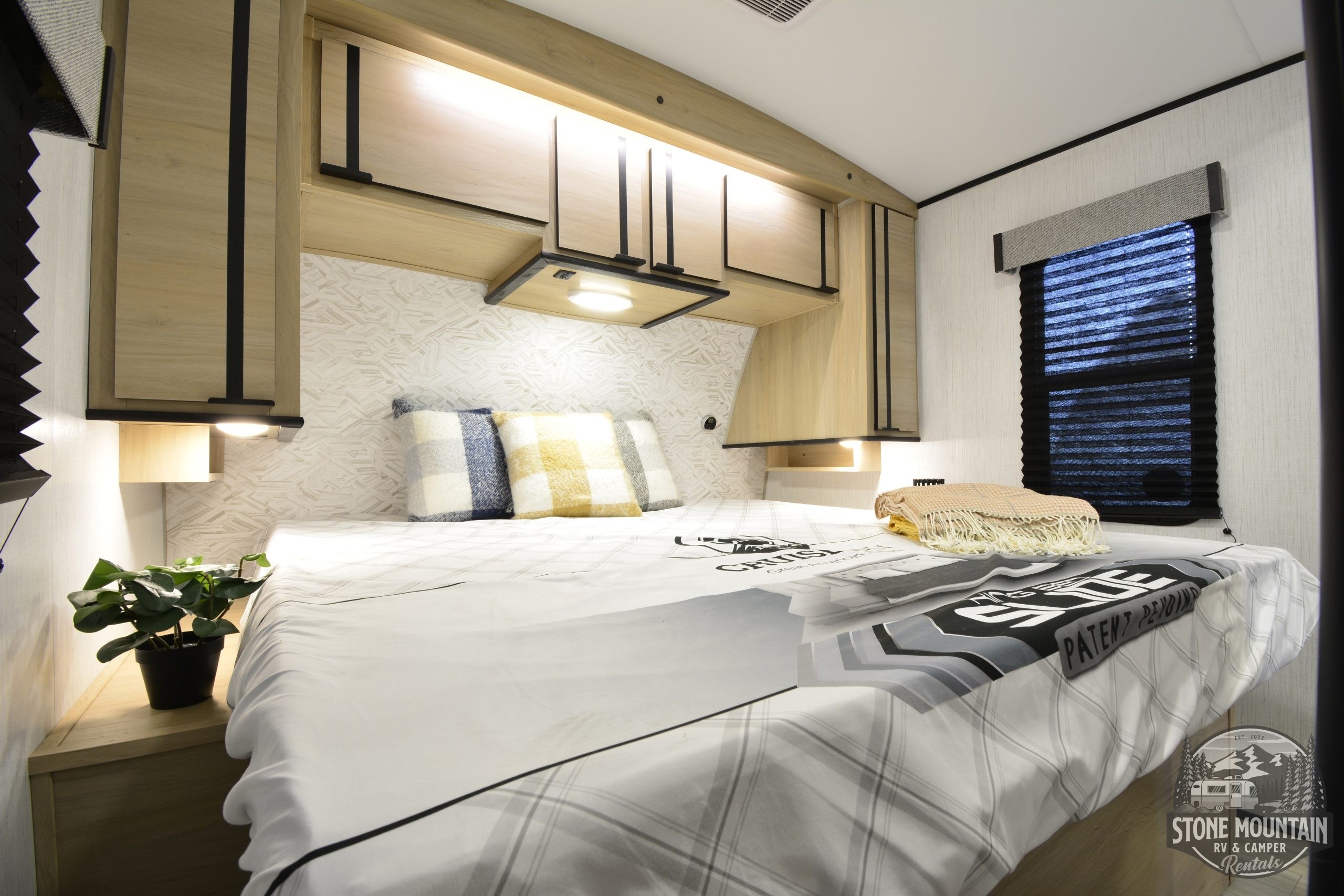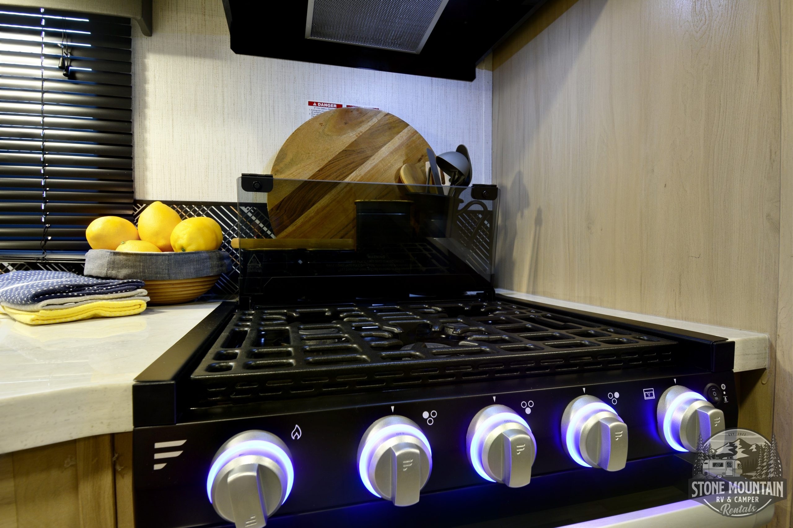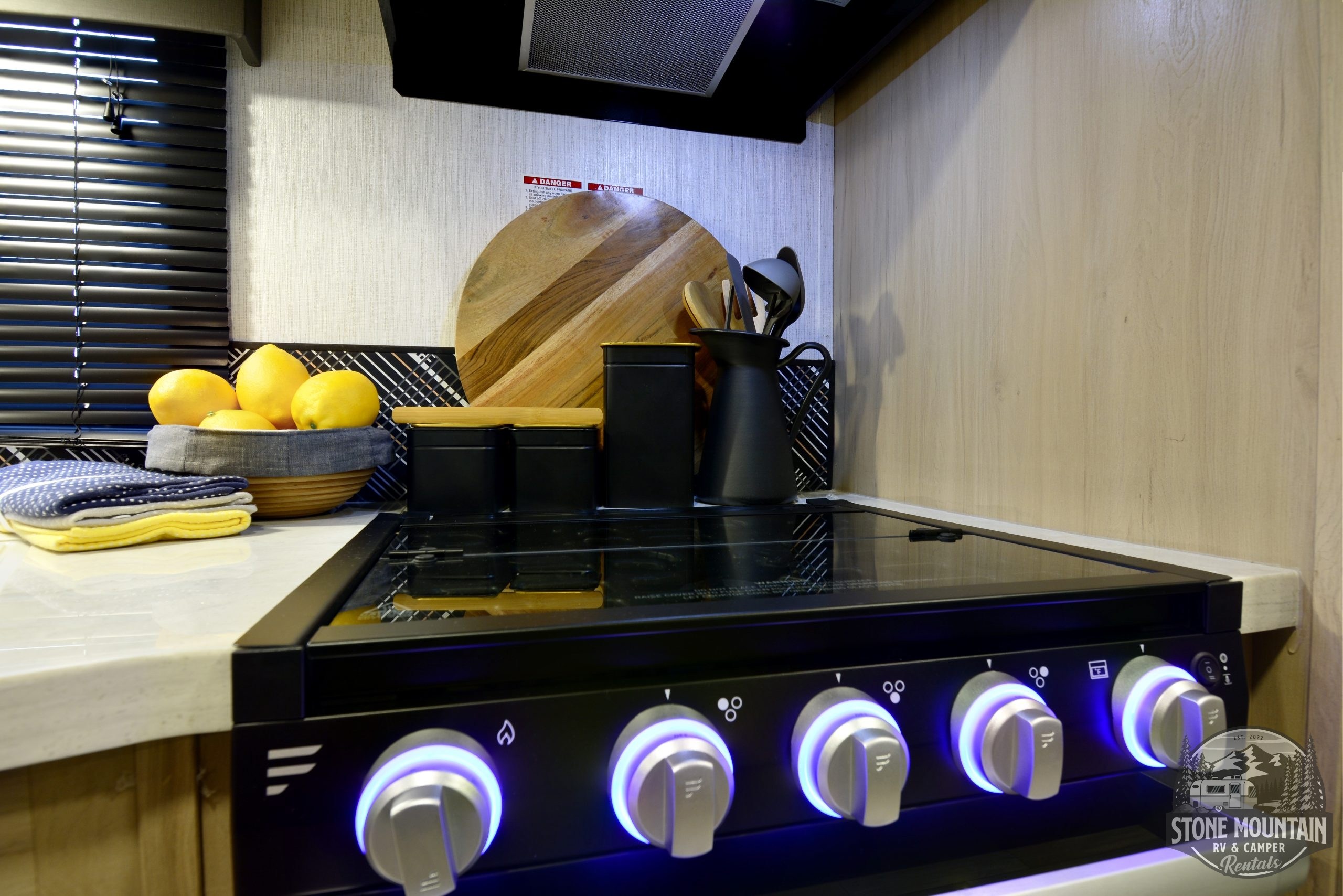 - End Your Day in Comfort After a day of activities, relax in the camper’s luxurious amenities with a super comfy convertible couch for lounging and relaxing.