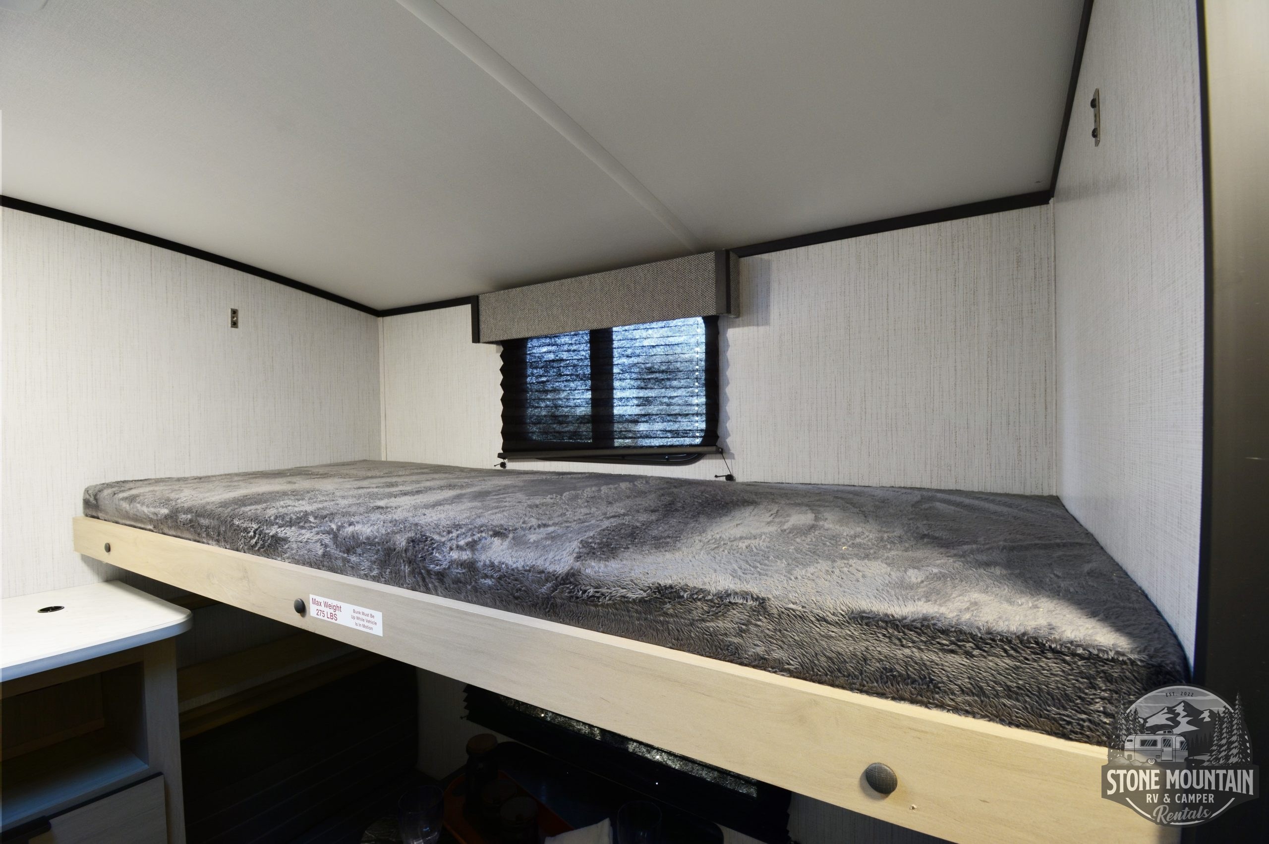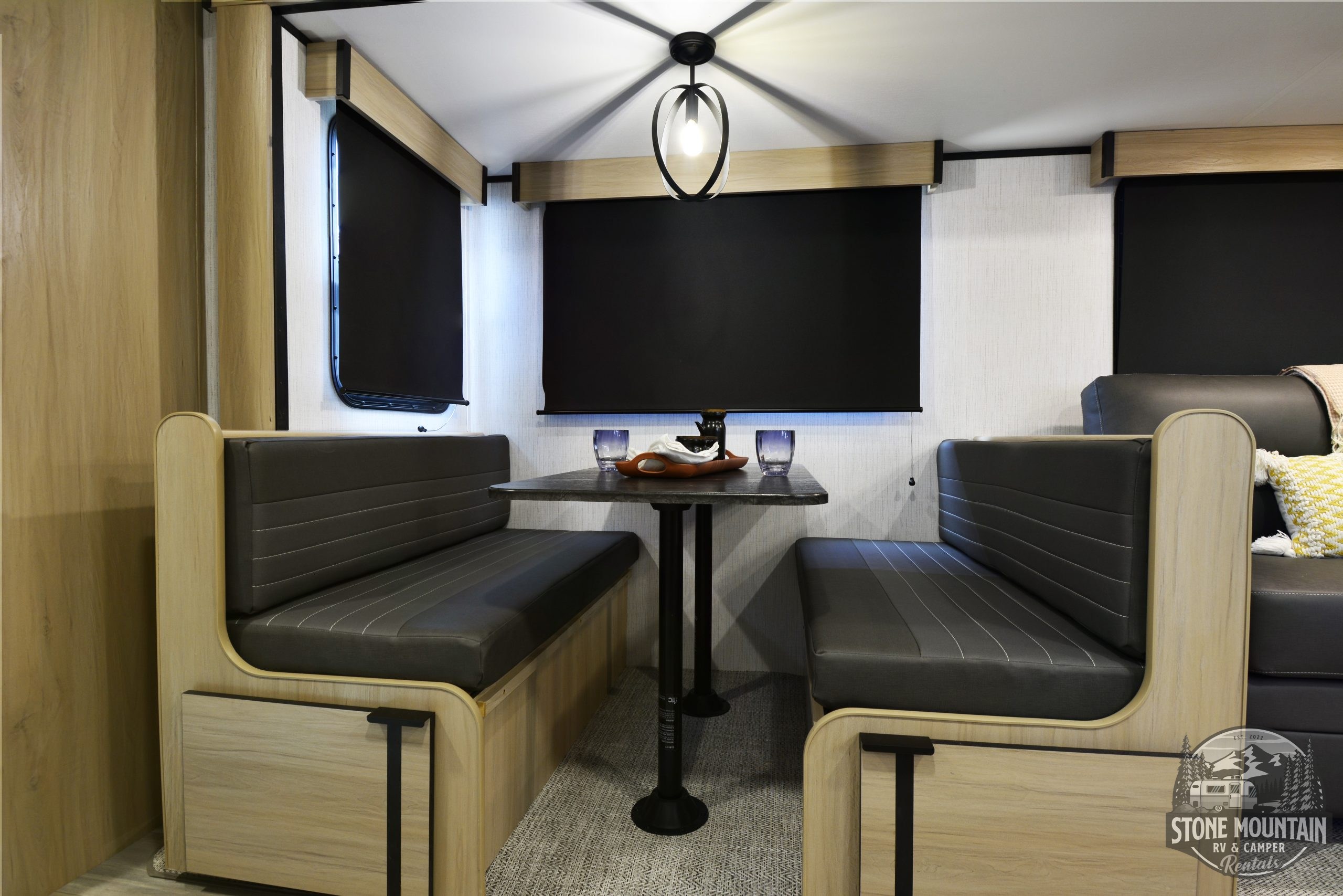 - Separate Secondary Bunk Room: Spacious bunk room with a convertible table with two lounge seats! Plenty of under-bed and cabinet storage.